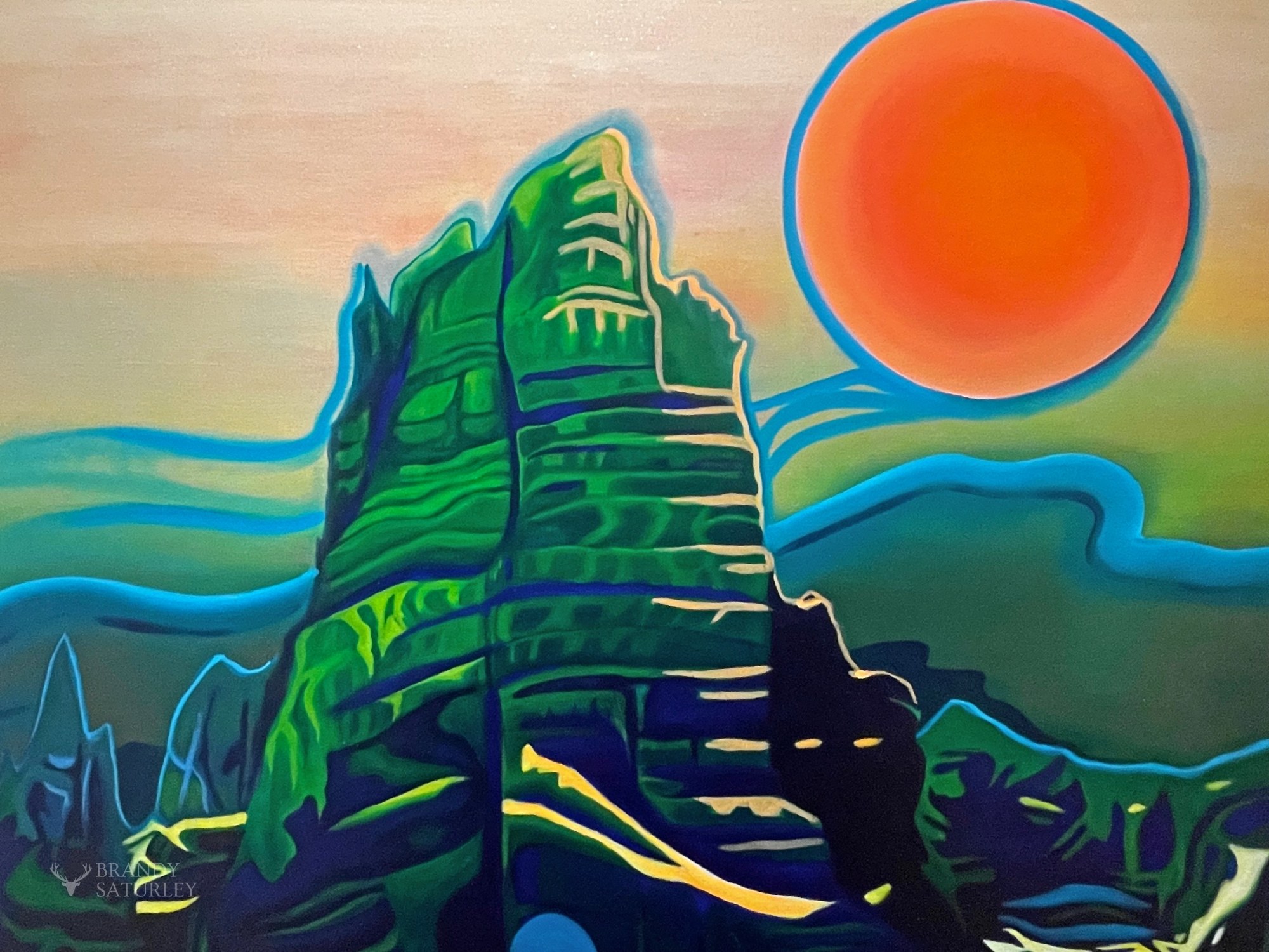 A painting Tower of Babel mountain, in the Bow range in Alberta, with rising sun. Supersaturated pop art colors of blue, green and orange, with s modern twist. Abstract forms throughout the mountain of colour and shadow make this a fun piece to discover something new in every day.
