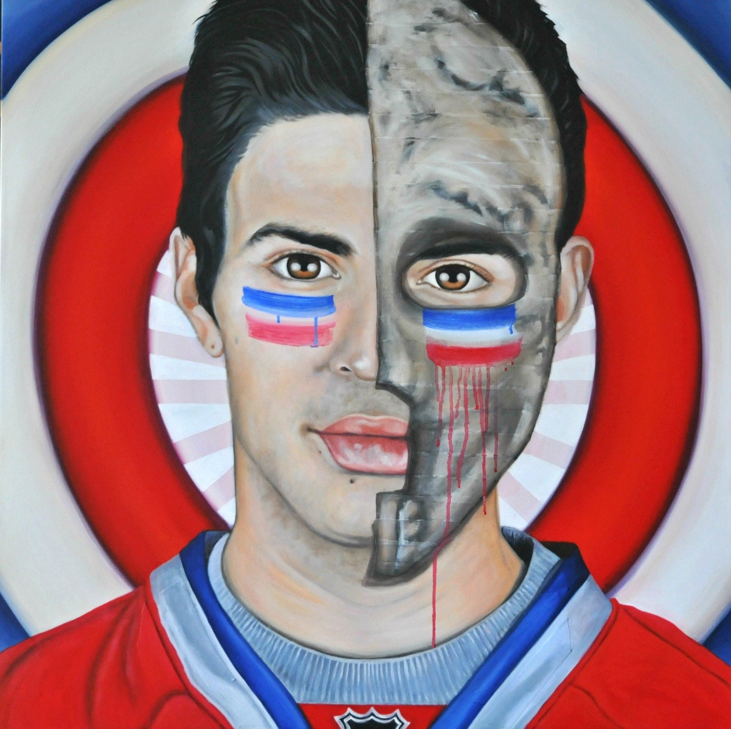 This painting of Montreal Canadiens goaltender, Carey Price is painted against a target painted in Habs colours. The target references being a goaltender but also throws to a famous Jasper Johns painting. This painting references three famous Canadiens goaltenders; Price, Plante and Dryden. The half goalie mask is made from Renfrew hockey tape applied to canvas, painted and sealed.