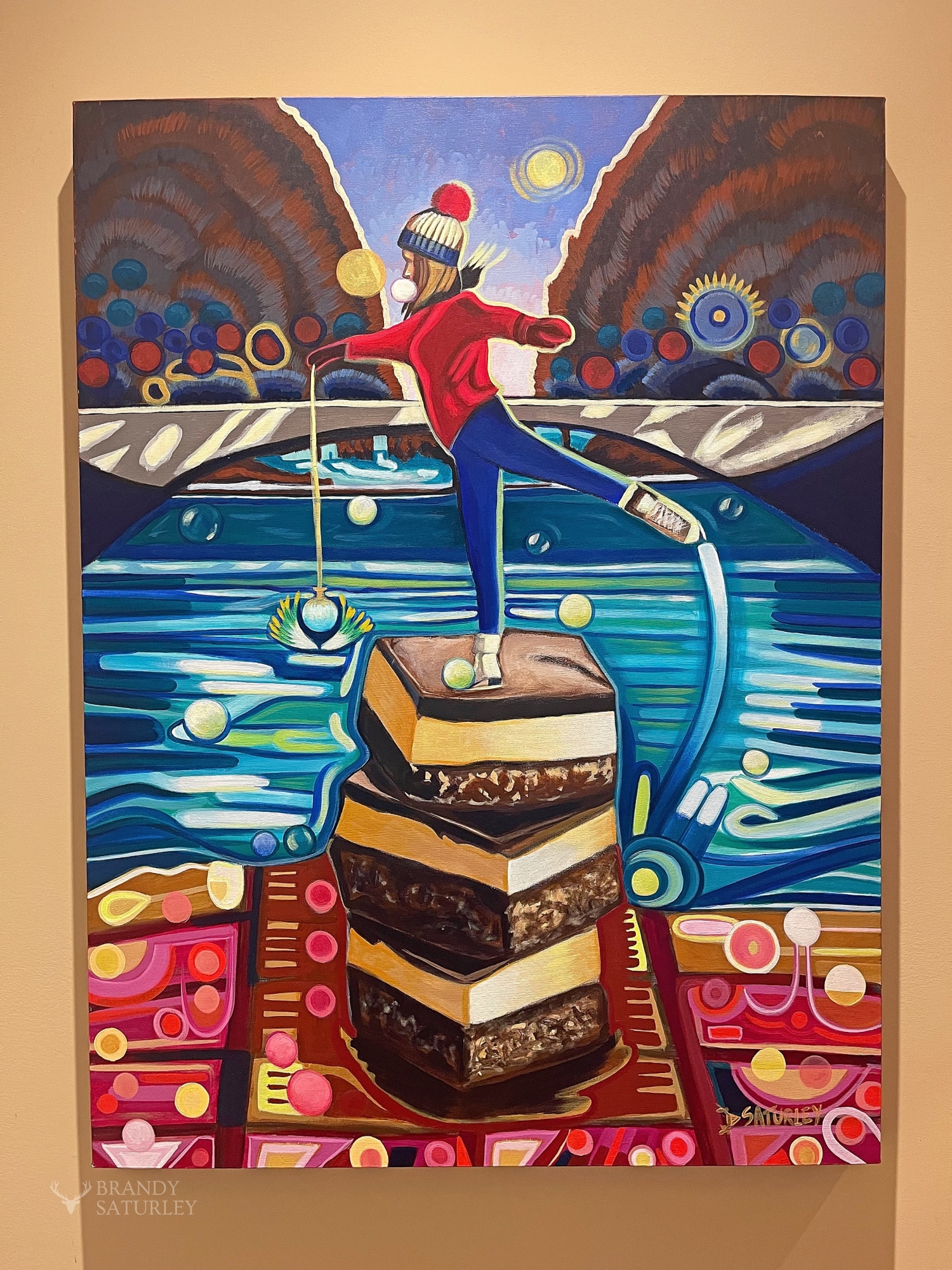 On Top of Nanaimo Bars all covered in winter. A figure skater wearing a toque and red sweater, blowing a bubble is perched on top of a stack of Nanaimo bars, with Candy colours below. She holds a string of ice that flows into a vase or vessel, from which daffodil flowers burst. An icy lake and bridge behind with sky of violet blue peering through the trees.