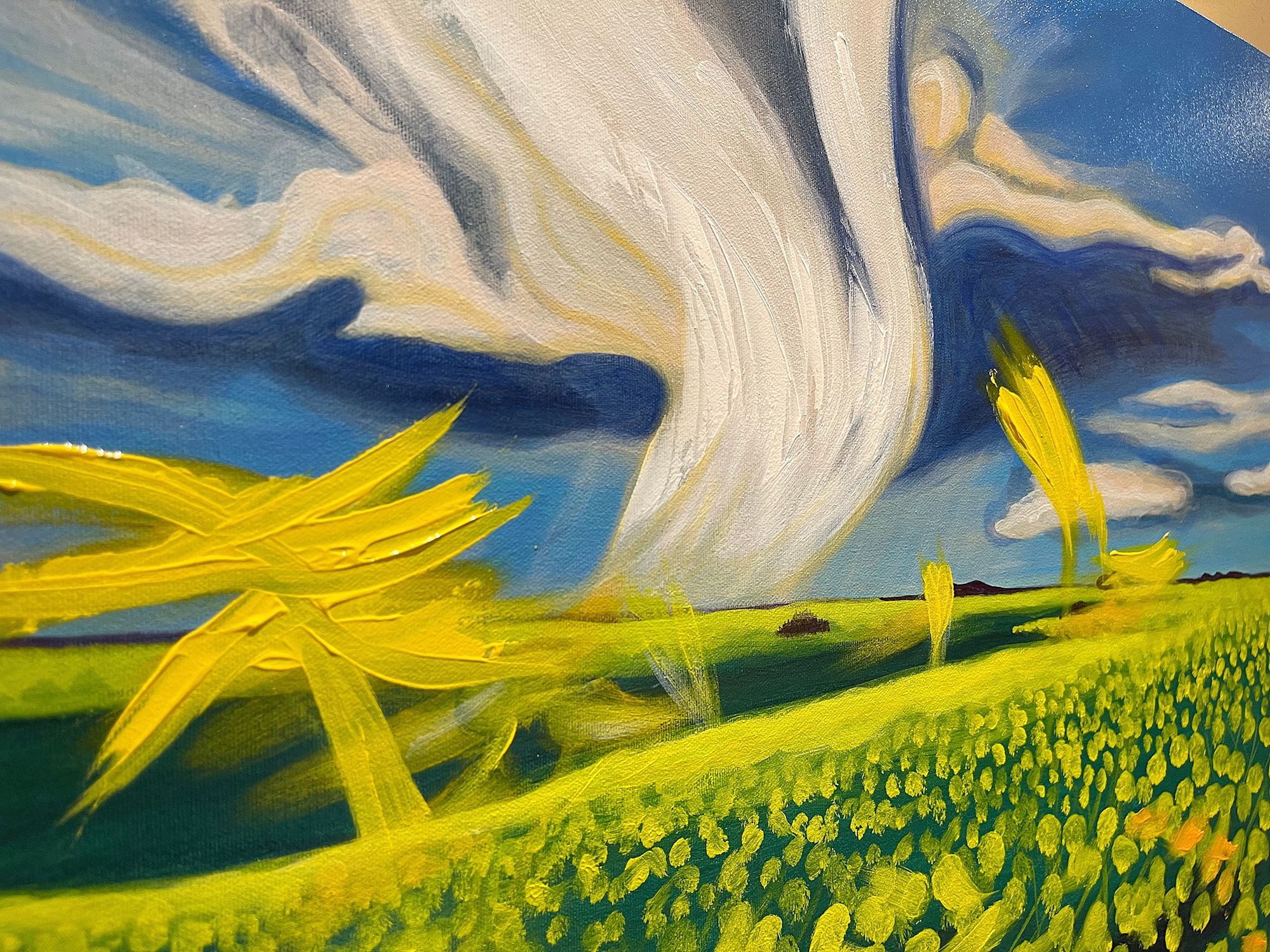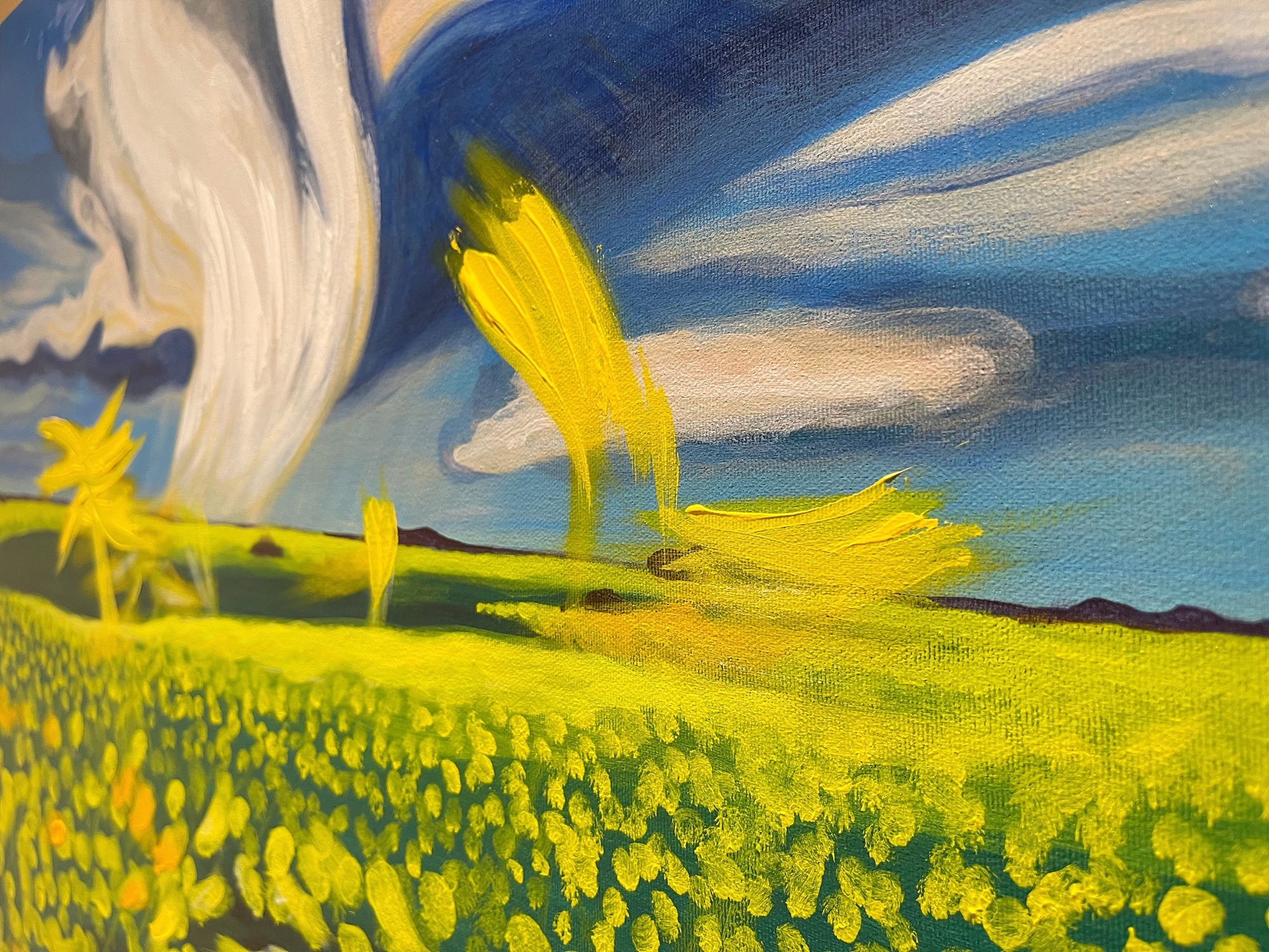 Prairie Flight – this painting comes from an evening, on a dirt road that ran between two crop fields of lemon and Indian yellow, against bright blue skies, near Brandon Manitoba.