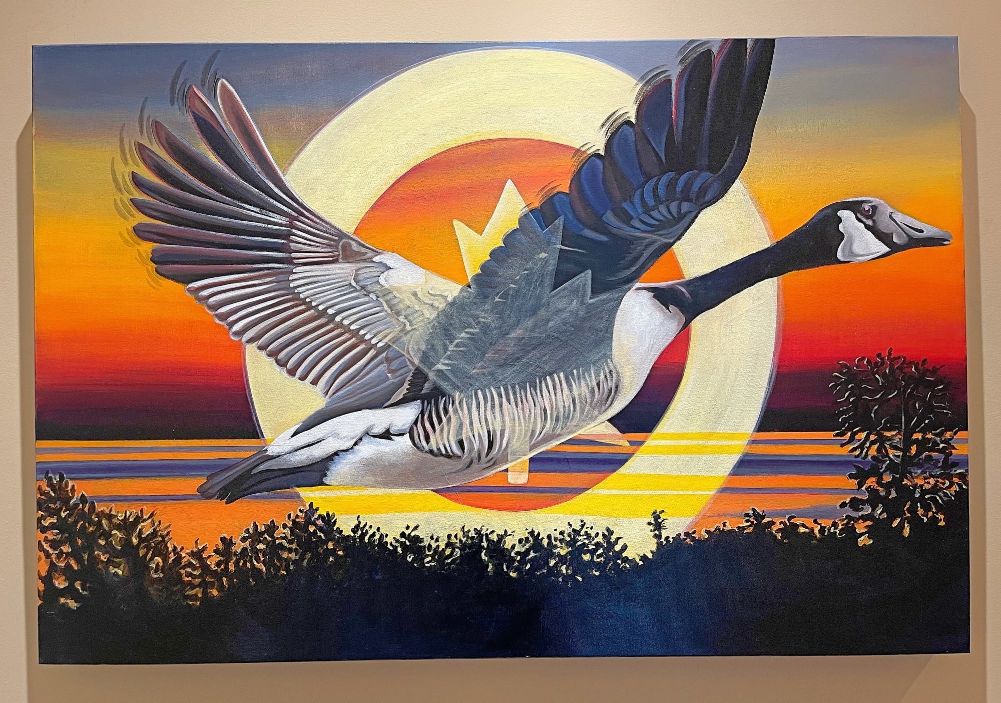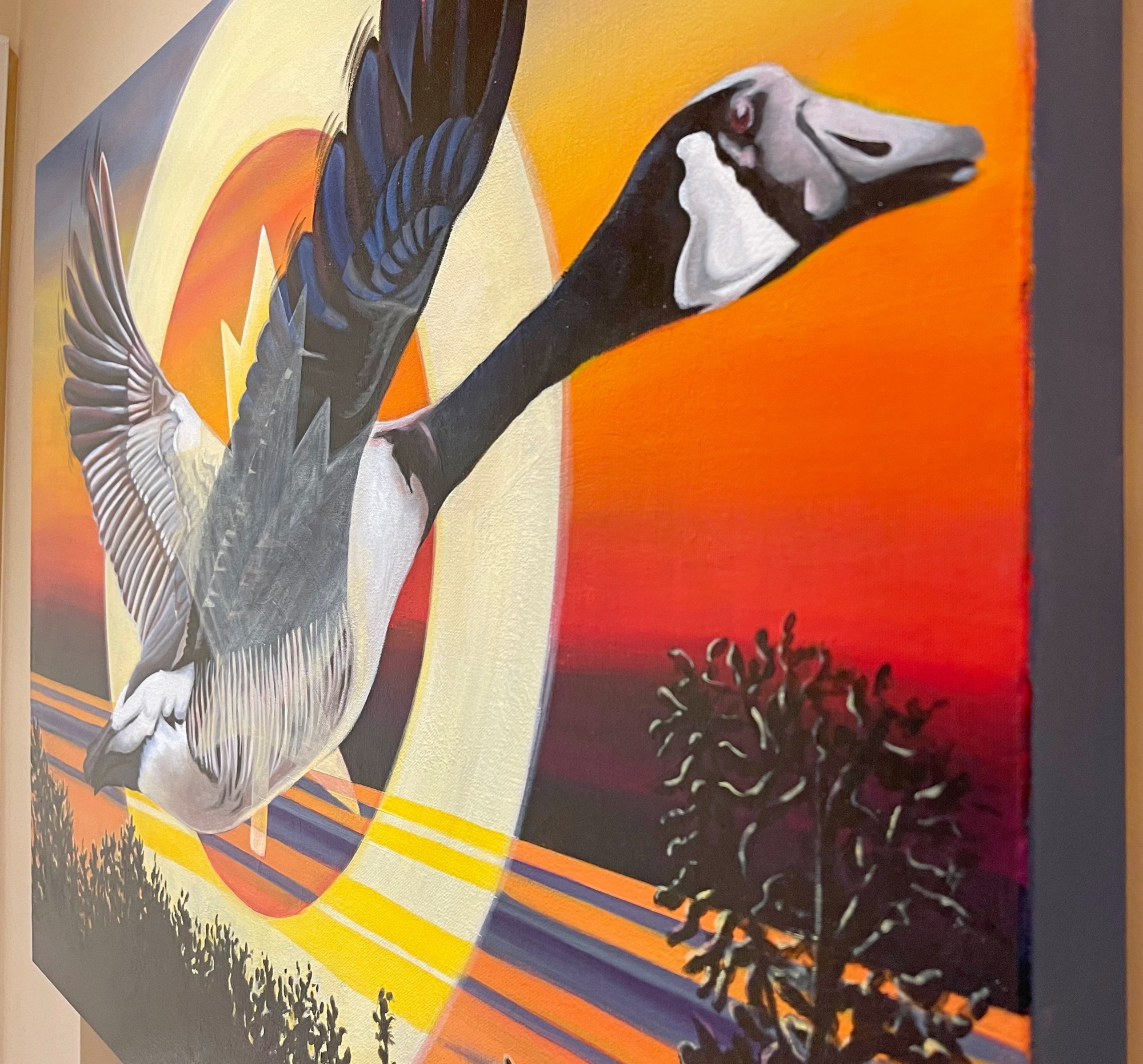 A symbolic painting of a Canadian goose in flight at sunset. Our Royal Canadian Air Force of the Esquimalt Lagoon estuary, near the Pacific Naval fleet on Vancouver Island, Canada.