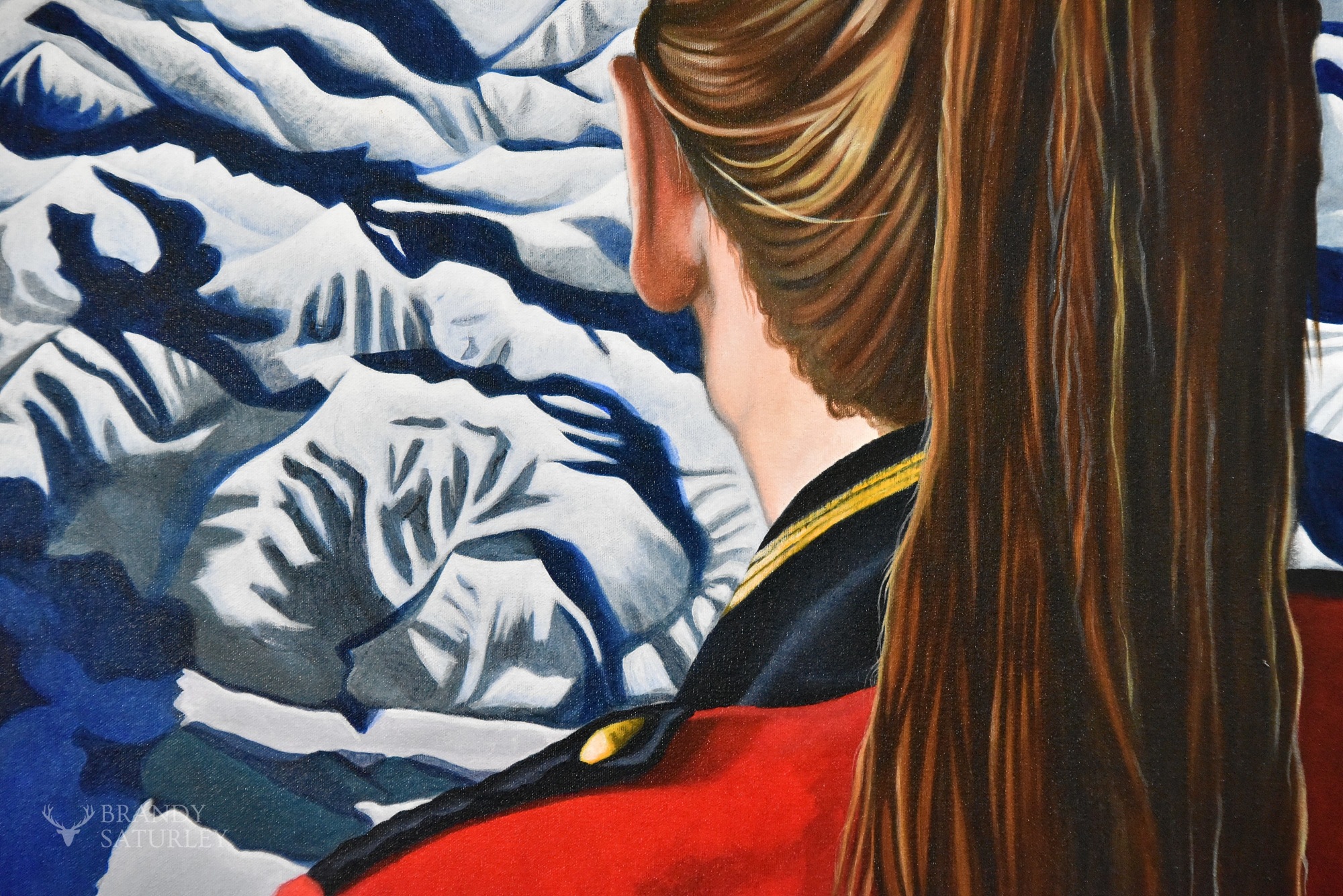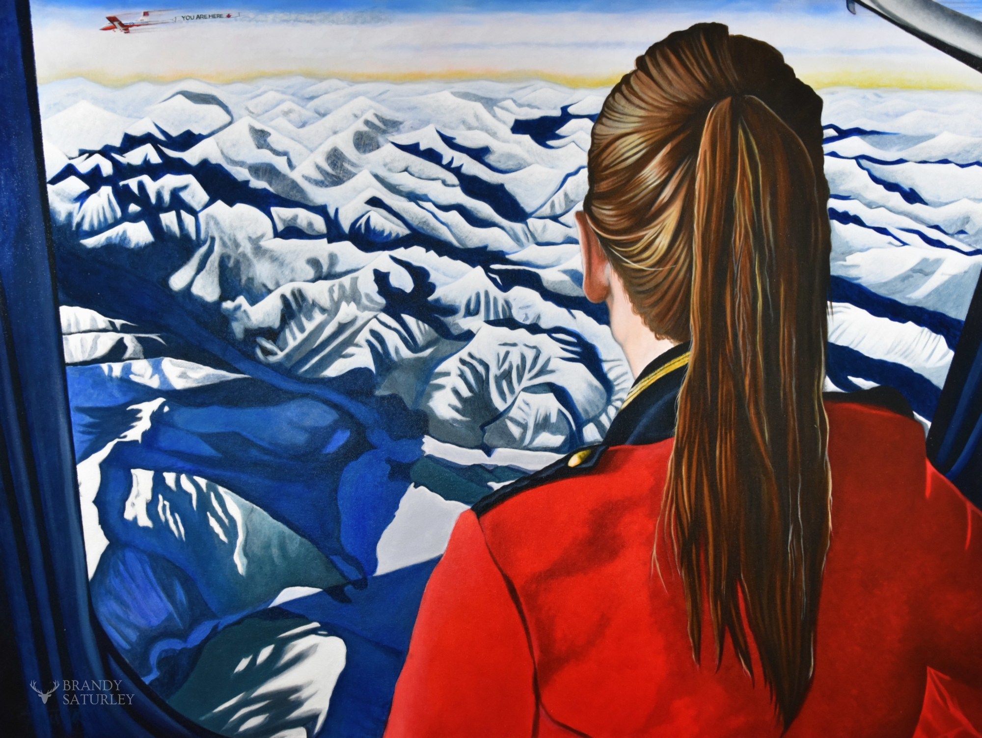 This piece speaks to the indomitable Canadian spirit and the exhilarating feeling seeing the rockies in all their glory. The airplane window larger than life, giving the feeling that you are part of the landscape. Far in the distance a Snowbird jet pulling a sign that reads, ‘You are Here’