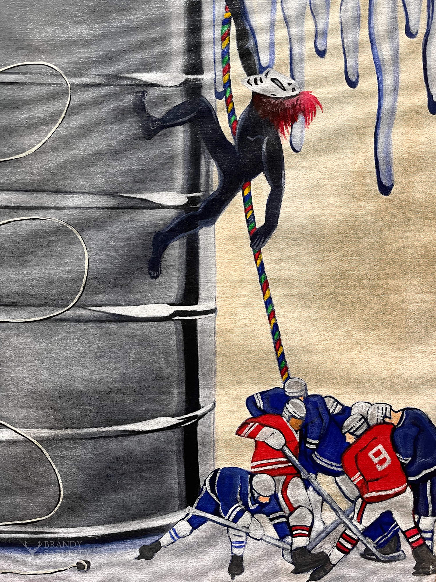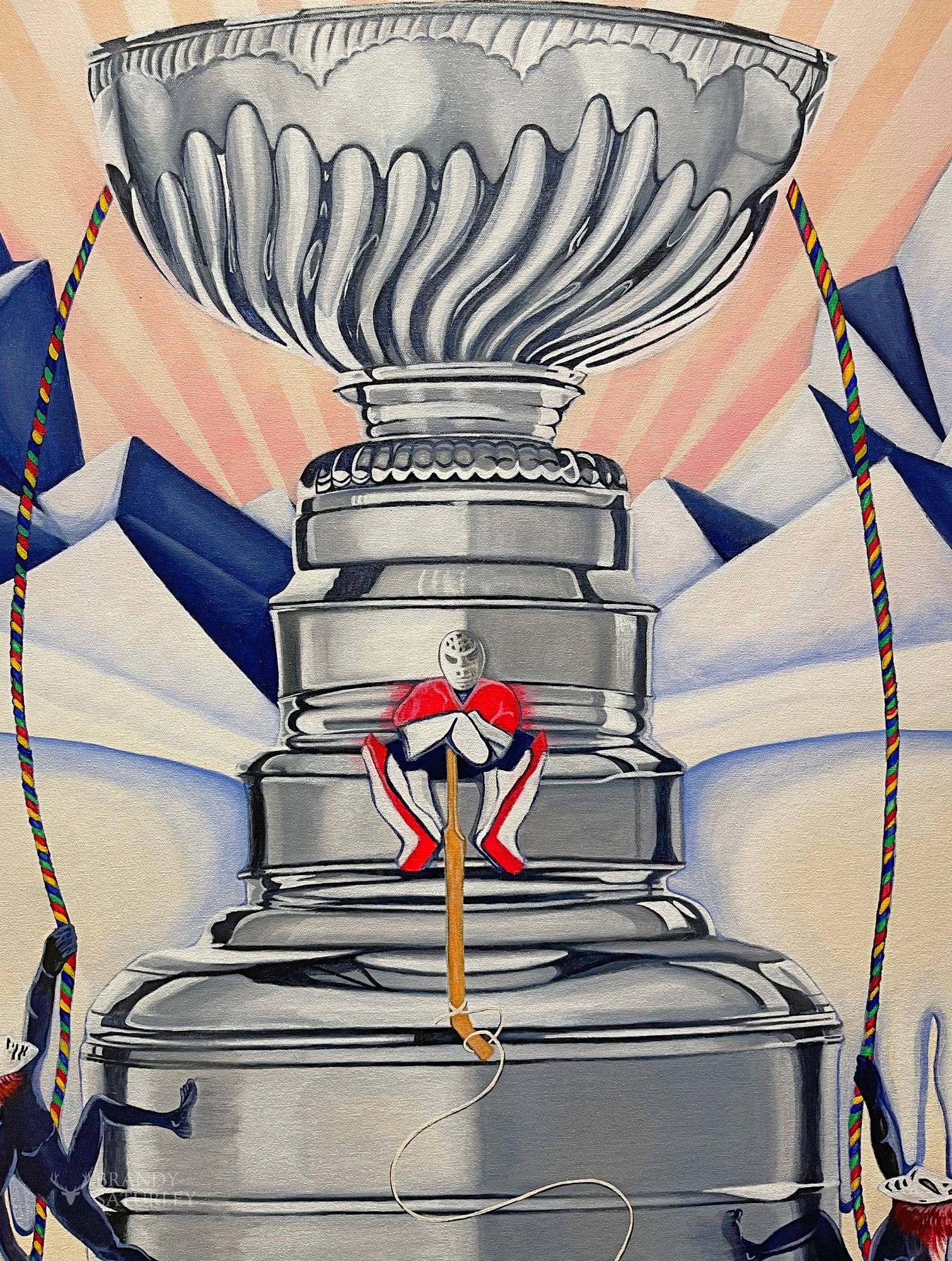 This piece speaks to the climb we face in all areas of life through referencing the long climb to achieving the Stanley Cup. The piece carries heavy symbolism with Lawren Harris-esque rocky mountains in the background.