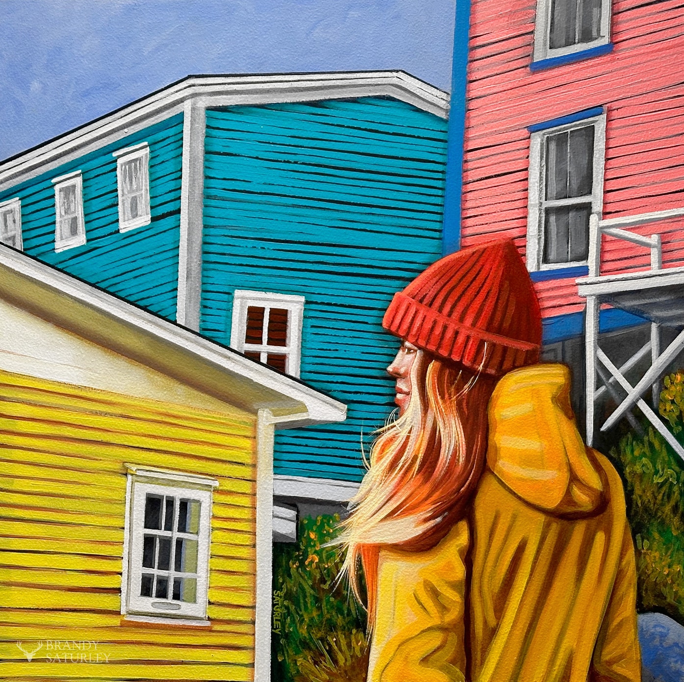 In her red toque and yellow slicker, love's quest does not belie.
