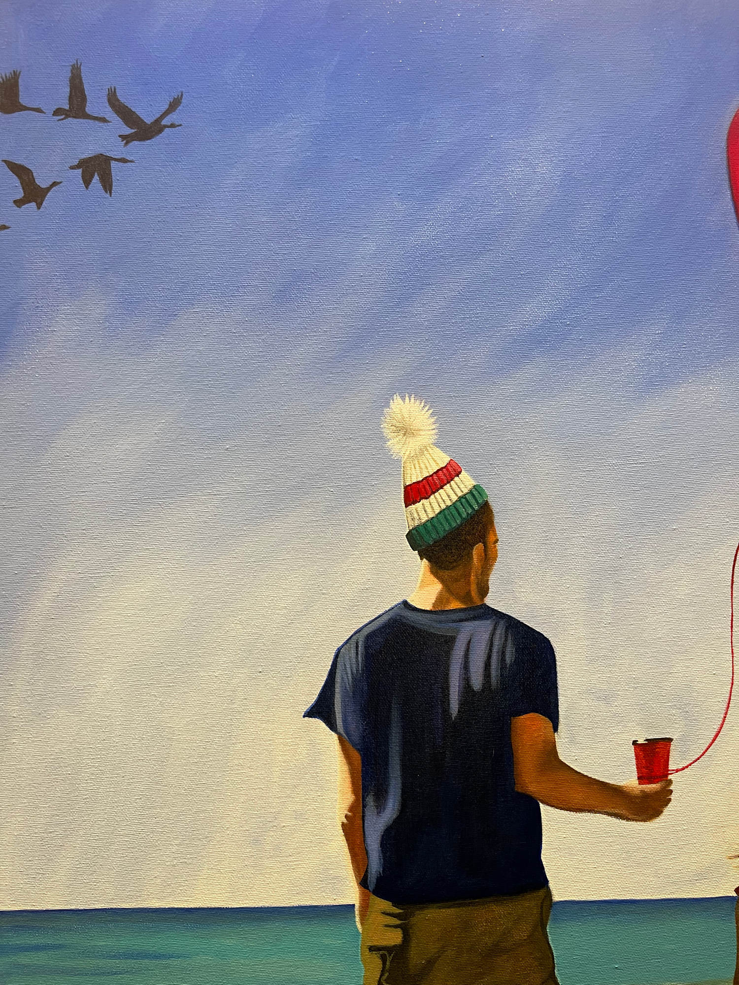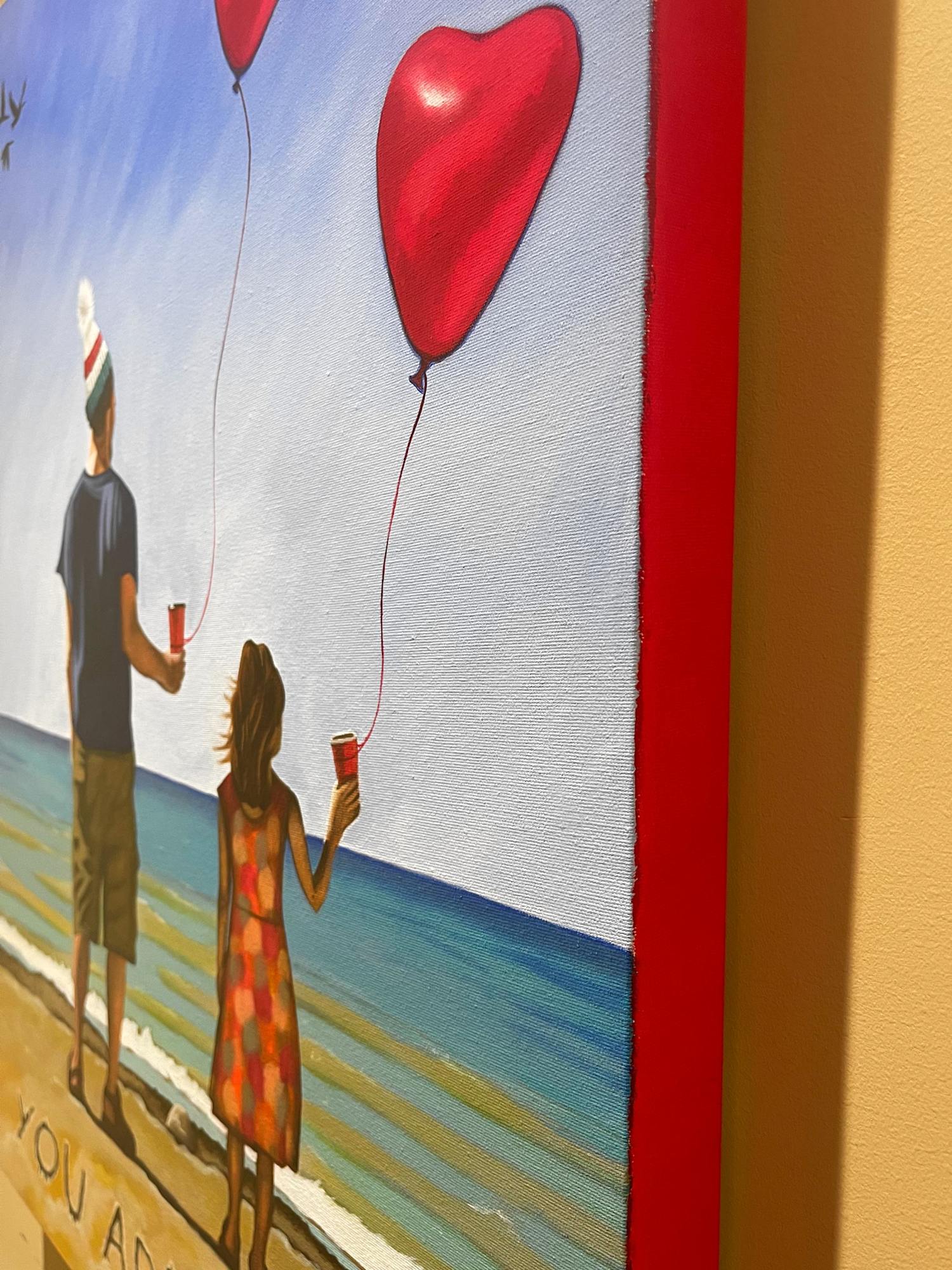 A portrait of a father and daughter on a beach, holding Tim Horton cups with heart balloons tied to their wrists. A group of Canada geese fly into frame in the distance and in the sand it says, 'You Are Here'. A portrait created for the People of Canada Portrait Project.