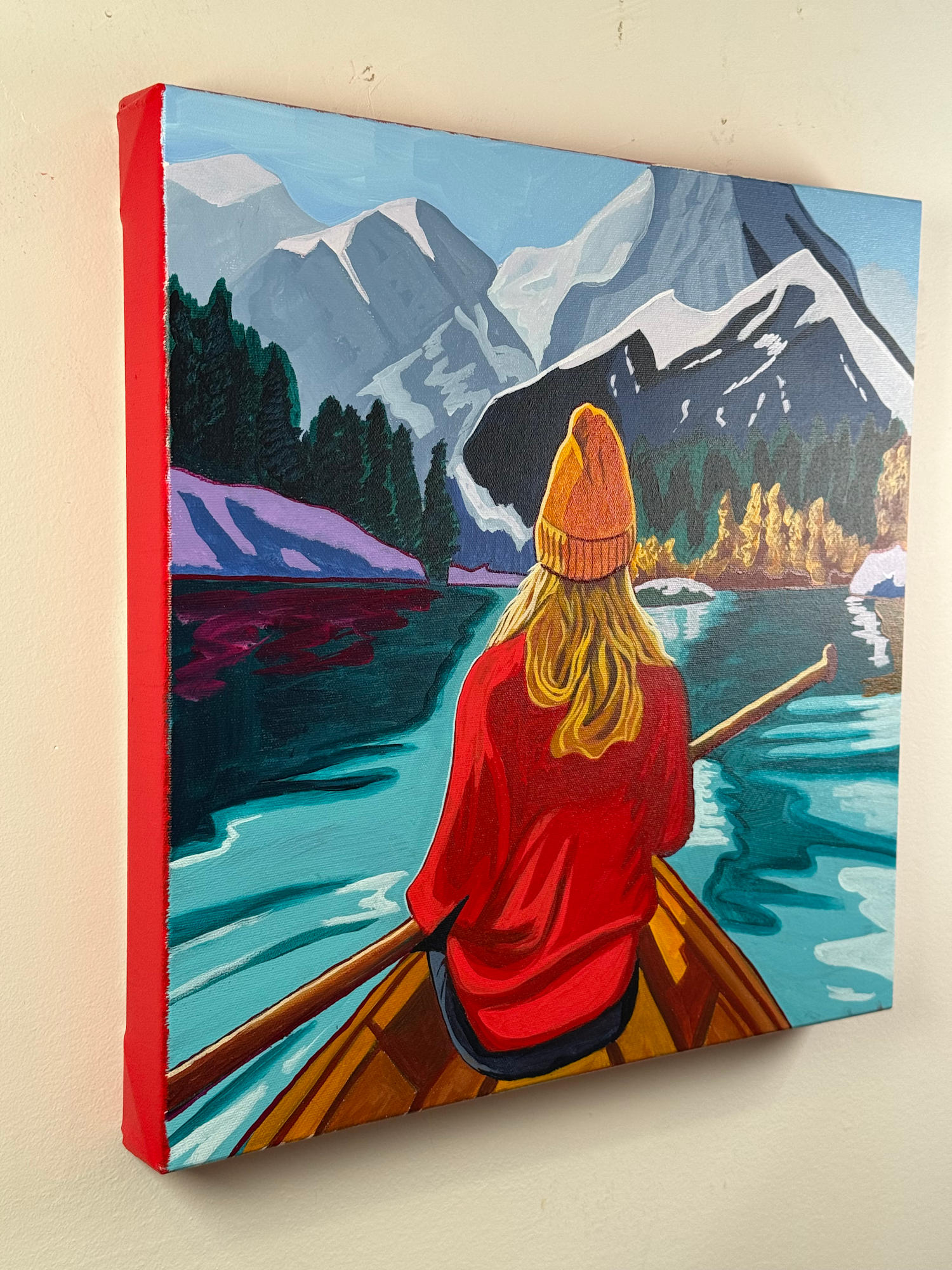 A woman wearing a toque and sweater paddles a canoe down a lake towards a snowy mountain range. It's a winter wonderland.