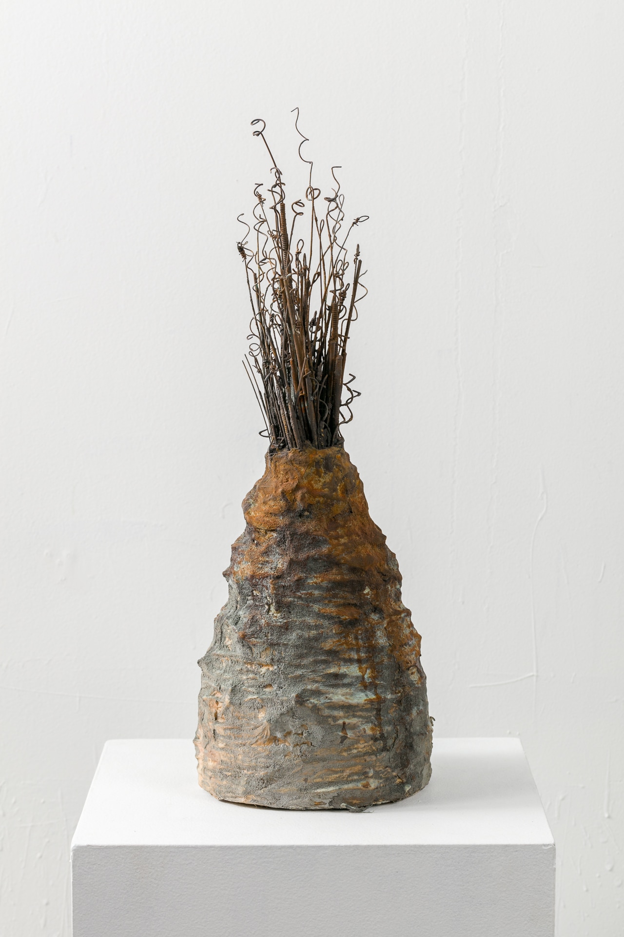 MessageConcrete, reactive rust paint, wax, pigment, piano strings, raffia, wood and metal objects, dirt, sand, acrylic, and matte medium.