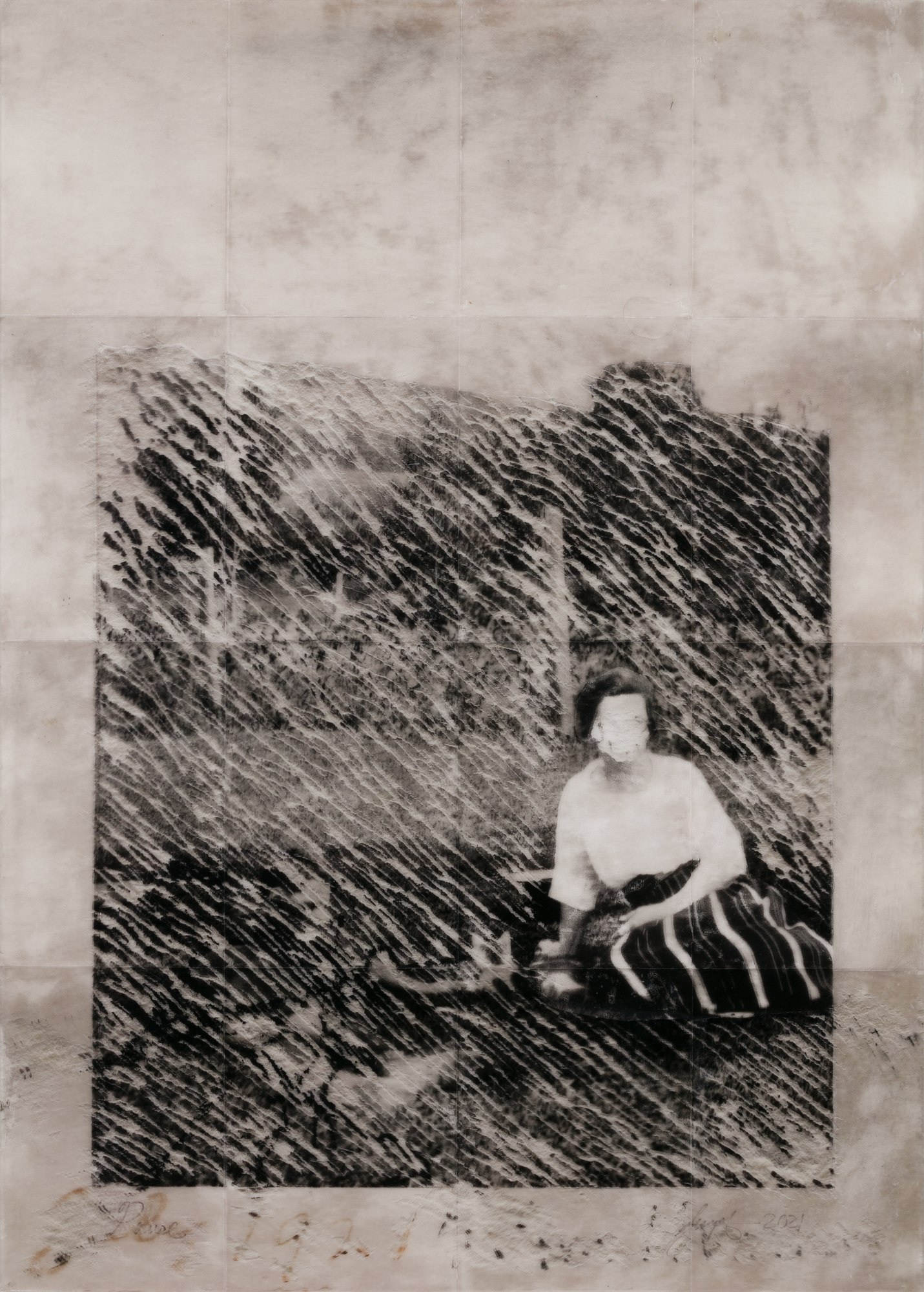 MessageFound and scratched vintage photograph, digitally captured and then ink transferred by hand onto an acrylic sheet, mounted to wood panel, acrylic, and colored pencil.
