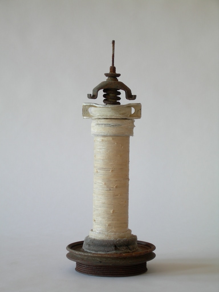 MessageWax, pigment, tulle, canvas threads, glass of large votive candle and metal objects.