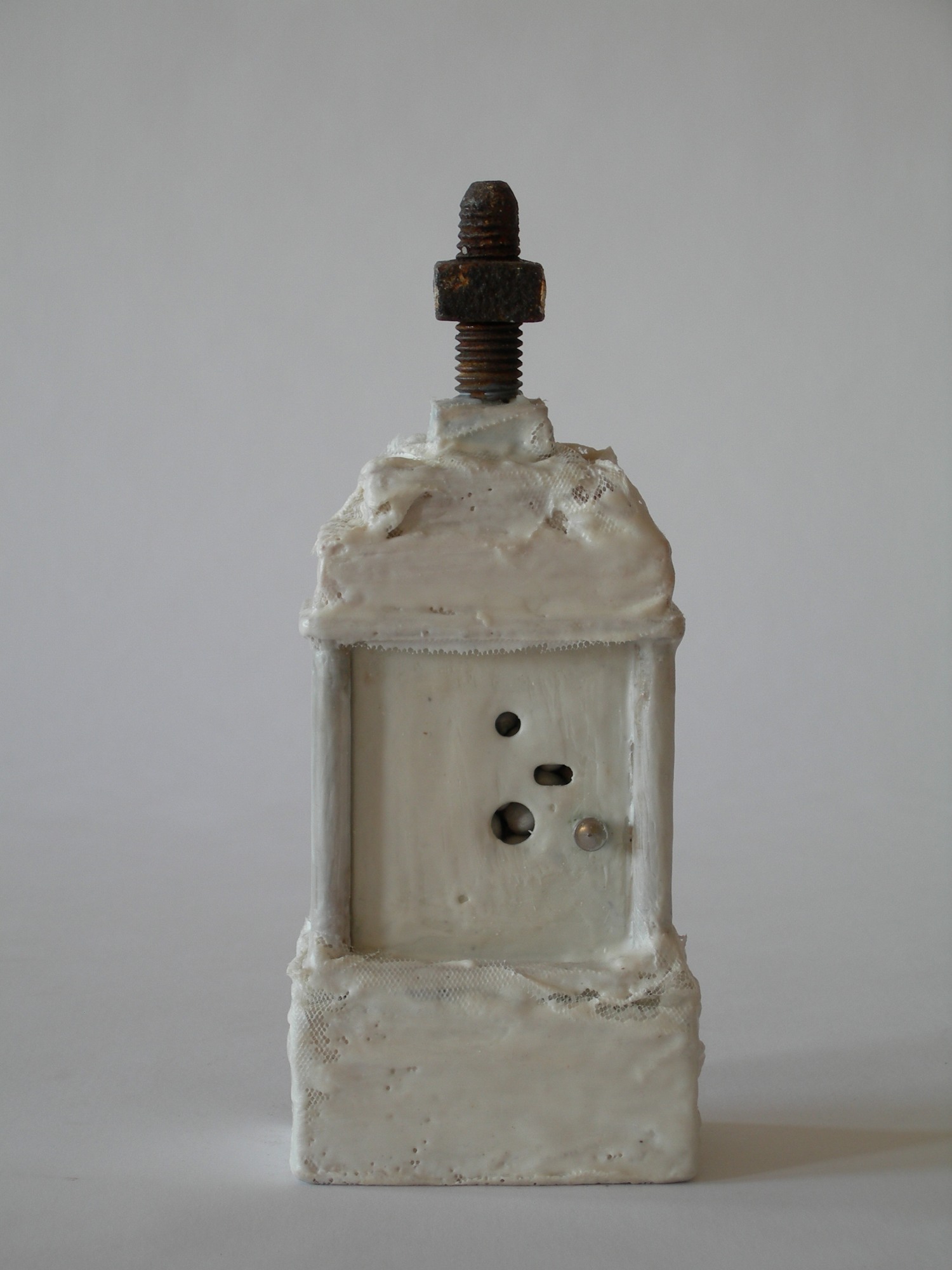 MessageWax, pigment, tulle, clock body, shells, metal and wood objects