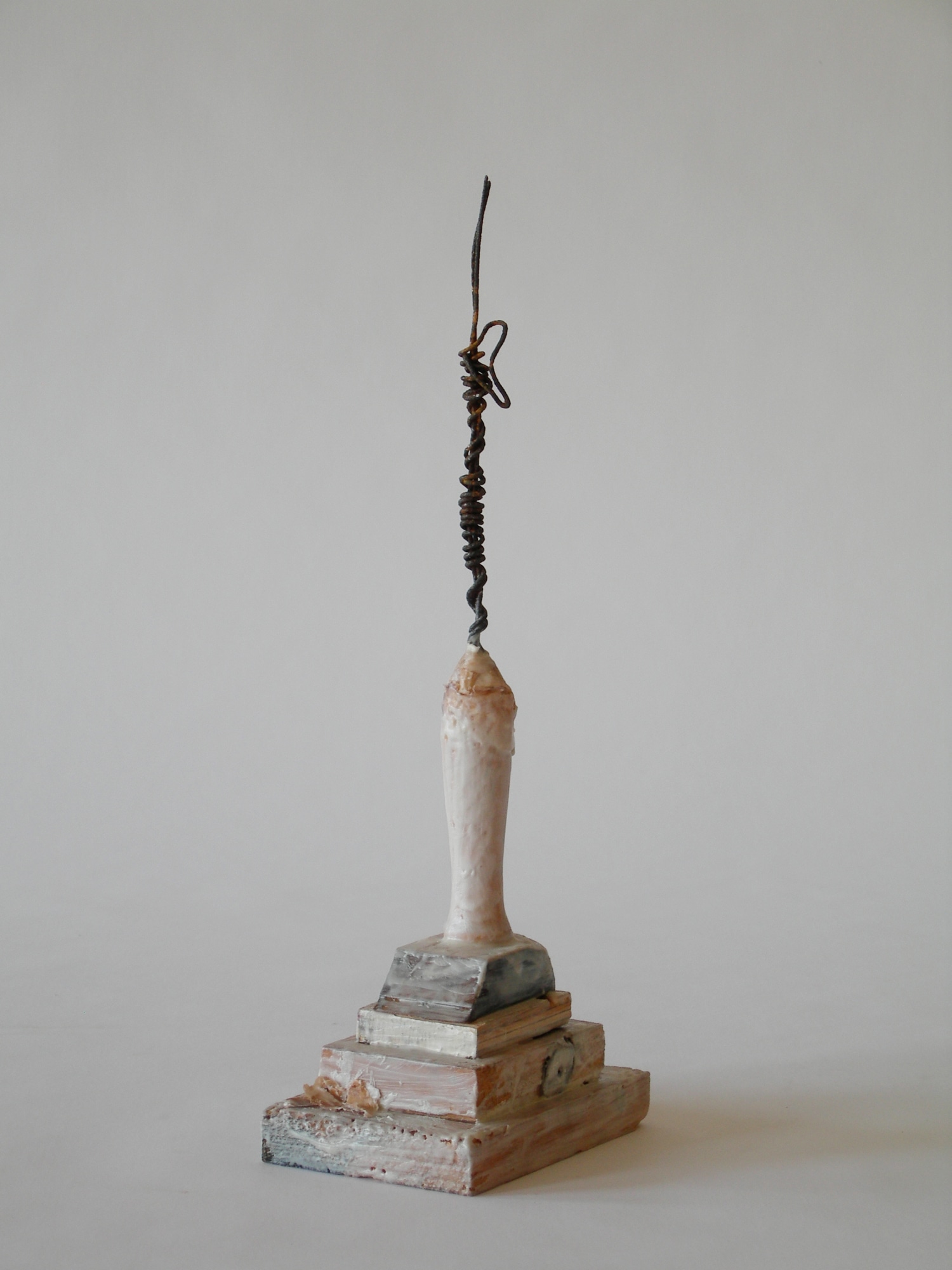 MessageWax, pigment, paper from steeped tea bags, wood and metal objects and matte medium