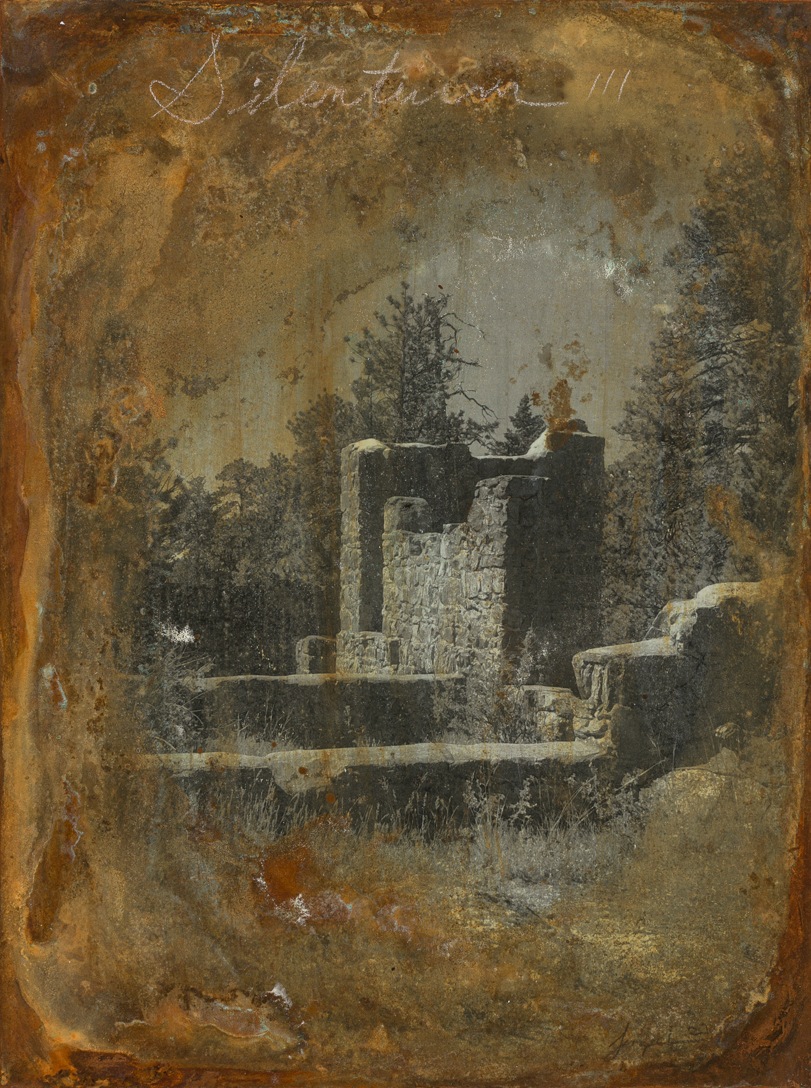 MessageImage transfer, acrylic, reactive iron paint, and colored pencil on wood panel.