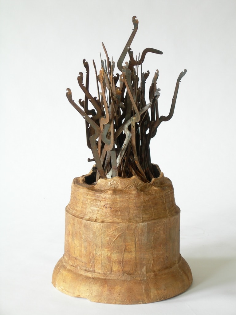 MessageWax, paper from steeped tea bags, typewriter parts, wood and metal objects and matte medium.