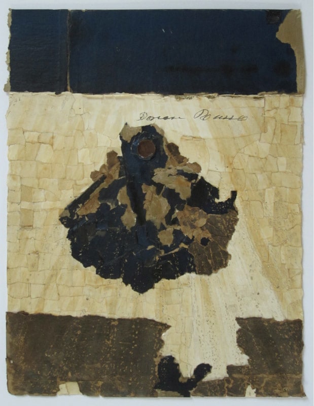 MessagePieces of a deconstructed vintage cardboard box, cardboard backing from an old frame, torn paper from an antique book, metal object, acrylic, and glue on paper.