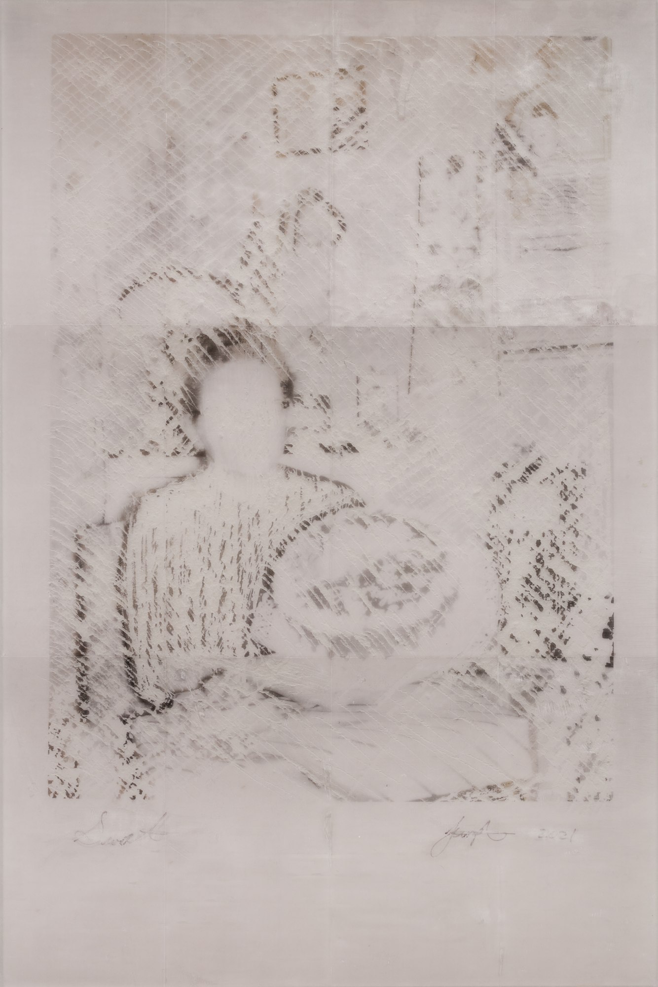 MessageFound and scratched vintage photograph, digitally captured and then ink transferred by hand onto an acrylic sheet, mounted to wood panel, acrylic, and colored pencil.