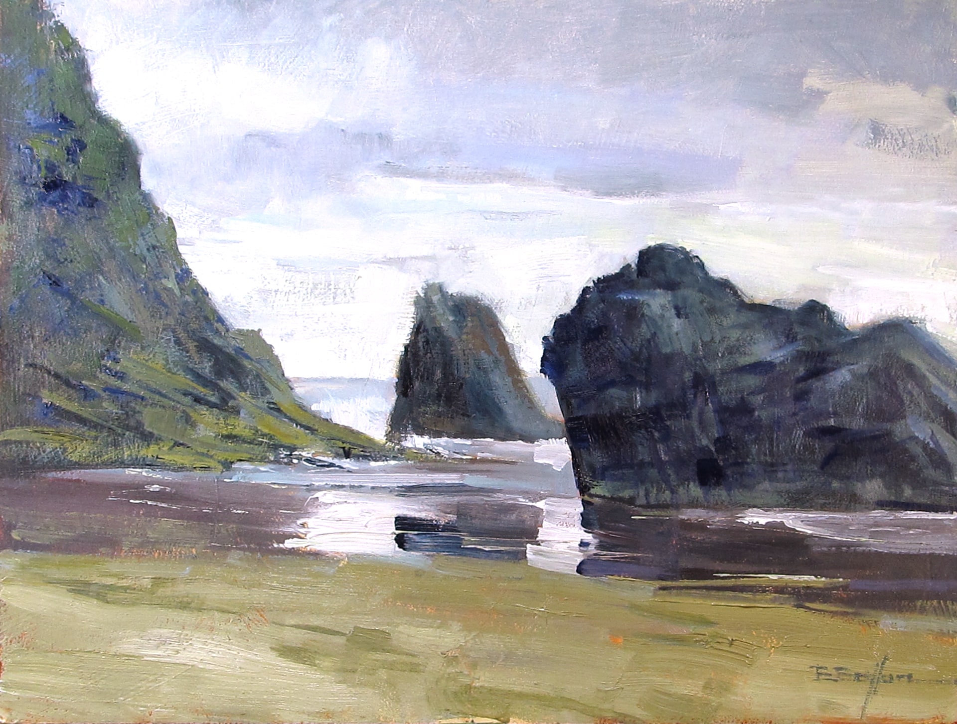 Oil on canvas, framed in a dusted black Front Range Frame Verona profile with gold inner liner.
