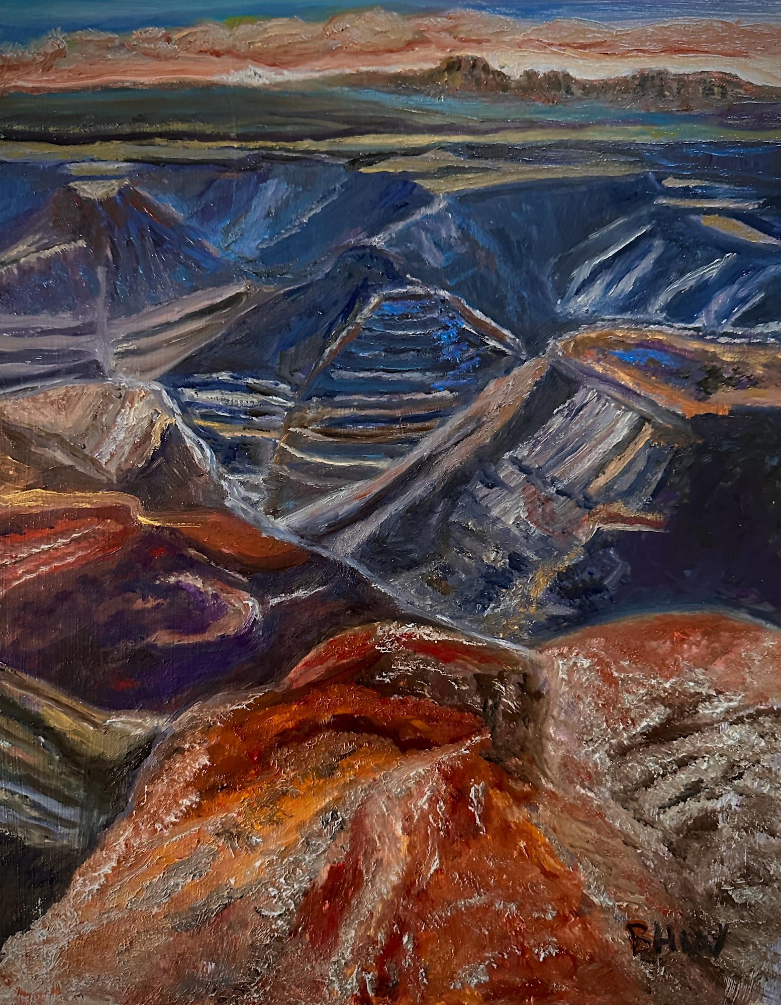 A vivid depiction of a rugged canyon showcases a variety of earthy and rich colors, with deep shadows and highlights adding depth to the landscape. The sky is painted with subtle hues, suggesting a serene and expansive horizon.