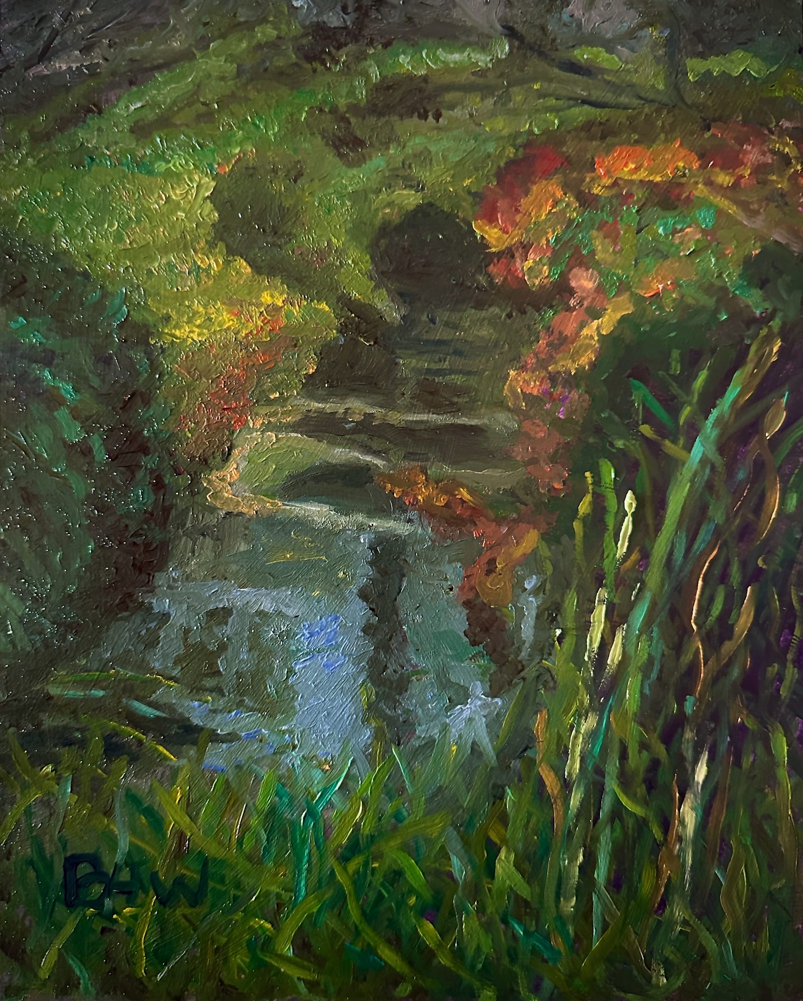 A serene stream winds through a lush forest landscape. Vibrant fall foliage and late day sunlight reflections create a tranquil scene.