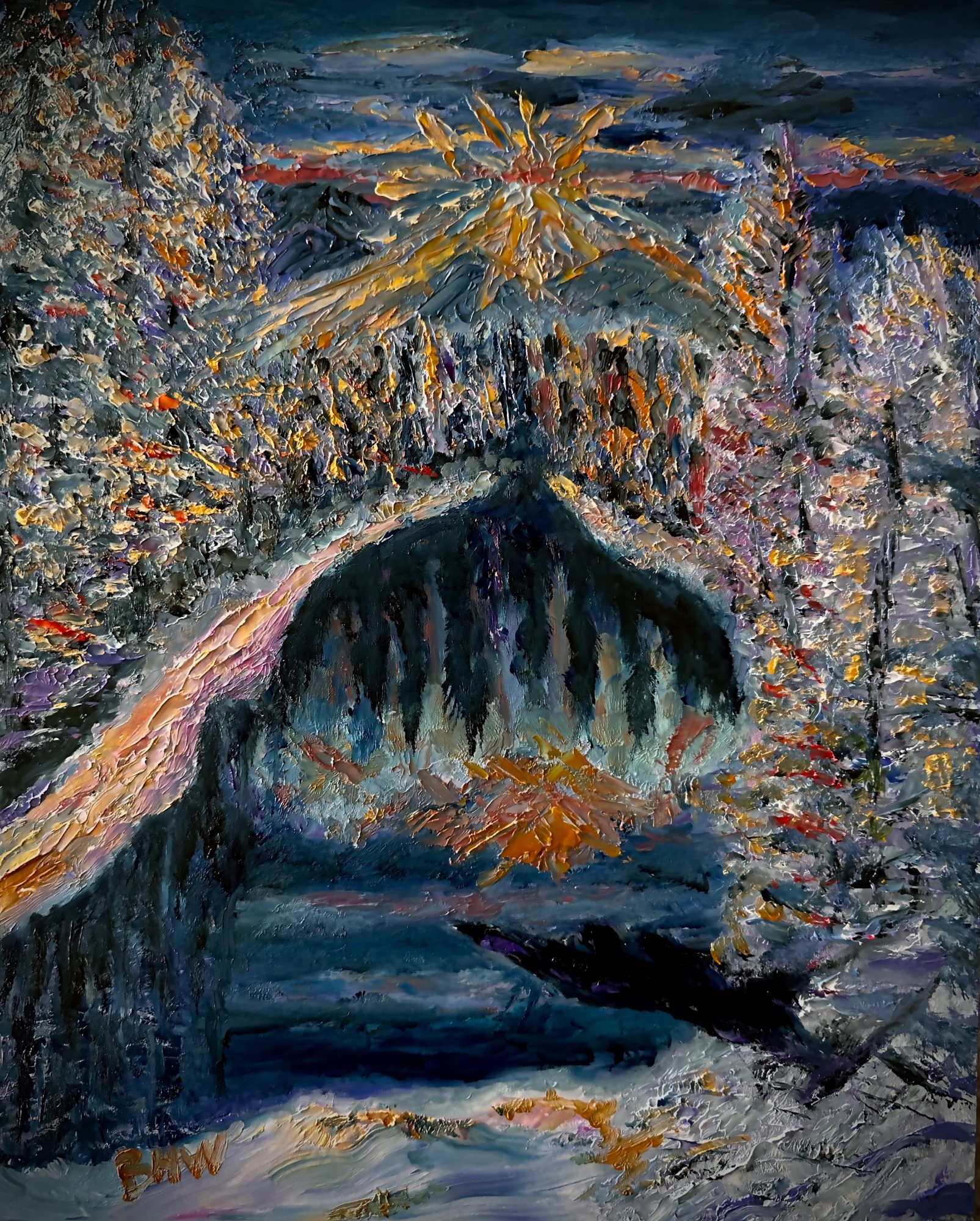 A vividly colored abstract piece captures dynamic brushstrokes and contrasting hues, suggesting a landscape with a central darkened mountain lake, illuminated by a fading sunset. The use of bright yellows and reds against the blues and greys creates a striking visual effect, evoking an impression of natural scenery seen through a unique artistic lens.