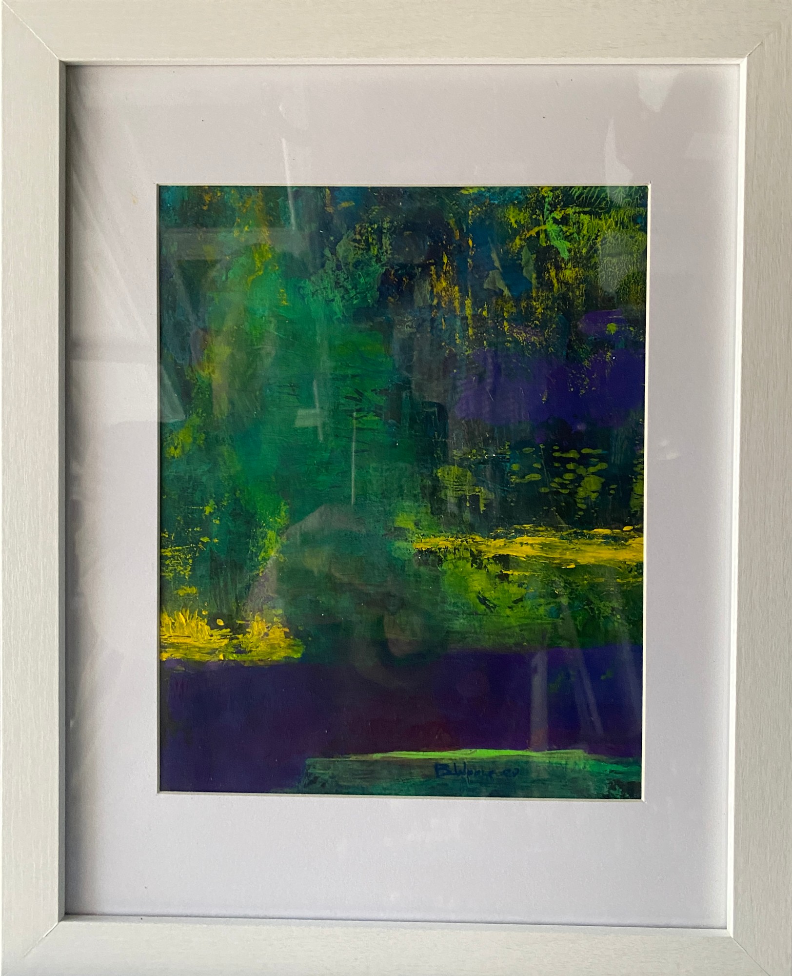 New framed works on paper behind glass framed in white or black. Happy colors that are fun, fun, fun to paint. This is one of the pieces that are part of a series of ten small works that I have completed.