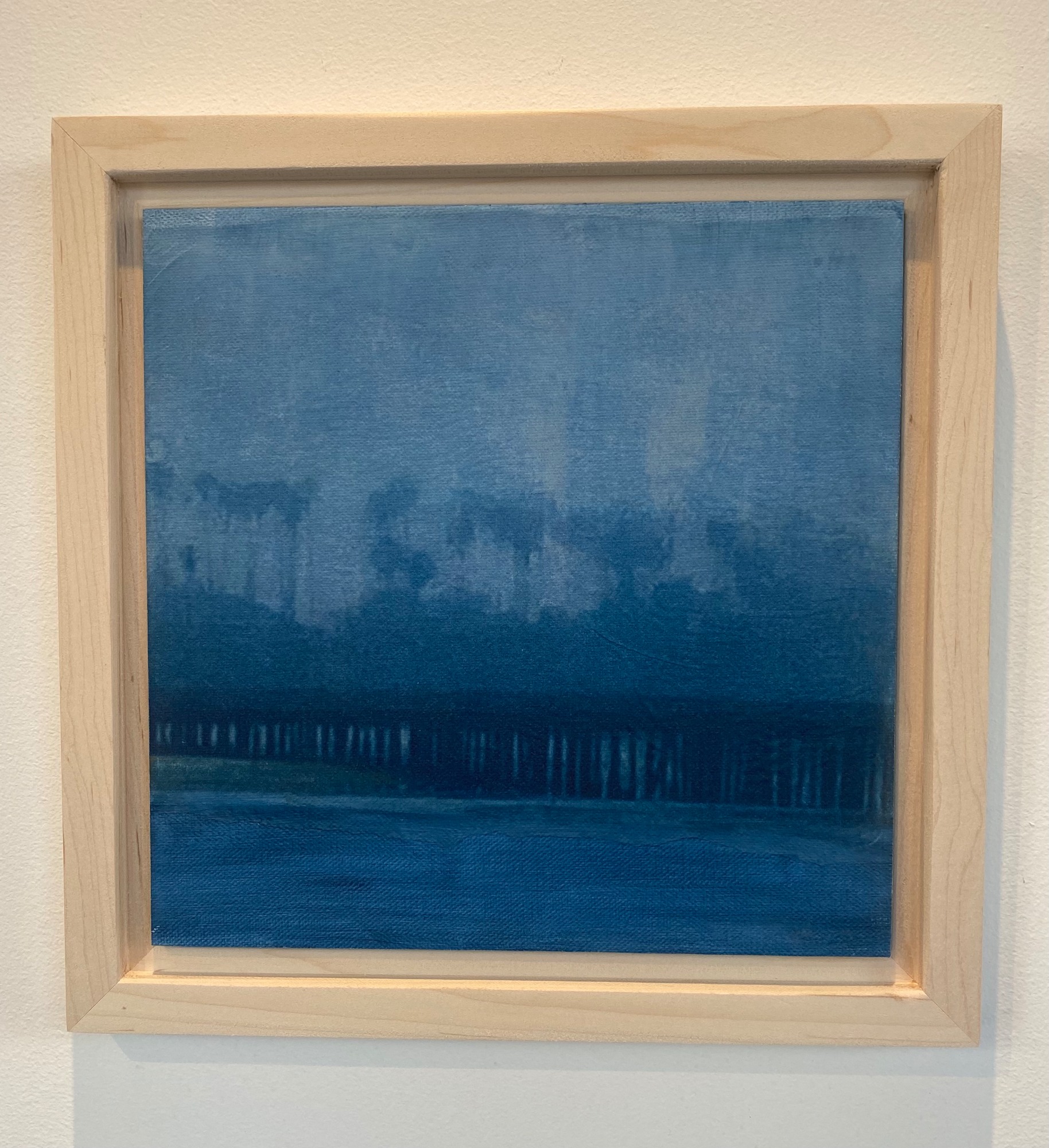 Stearn's Wharf Fog is a photo collage. It starts with a photo taken on a foggy morning from the sandbar opposite Stearn's Wharf in Santa Barbara. It's printed on antique onion skin typing paper and then sandwiched in a painting and finally printed on canvas board. The price includes the maple floater frame that is pictured.