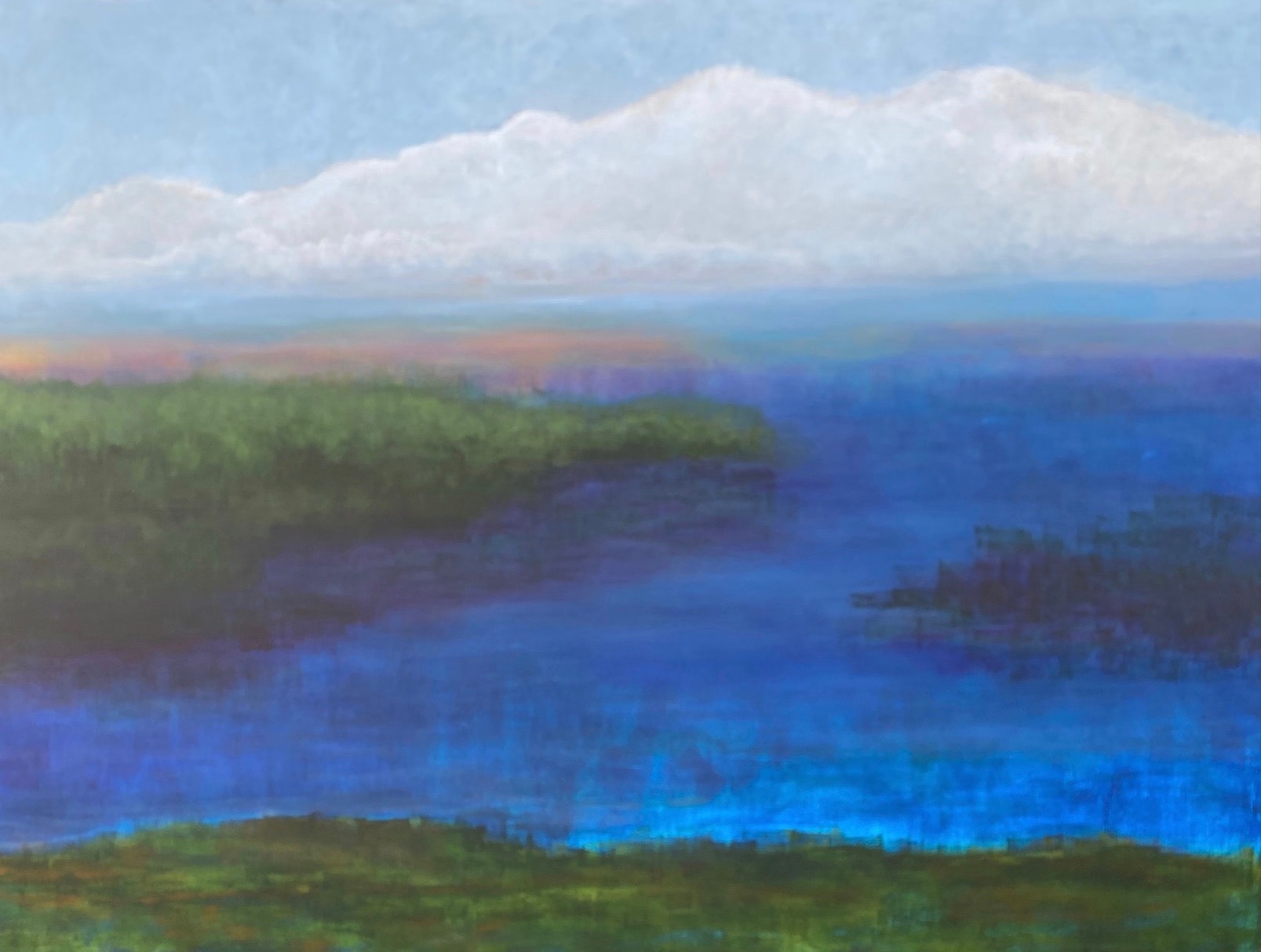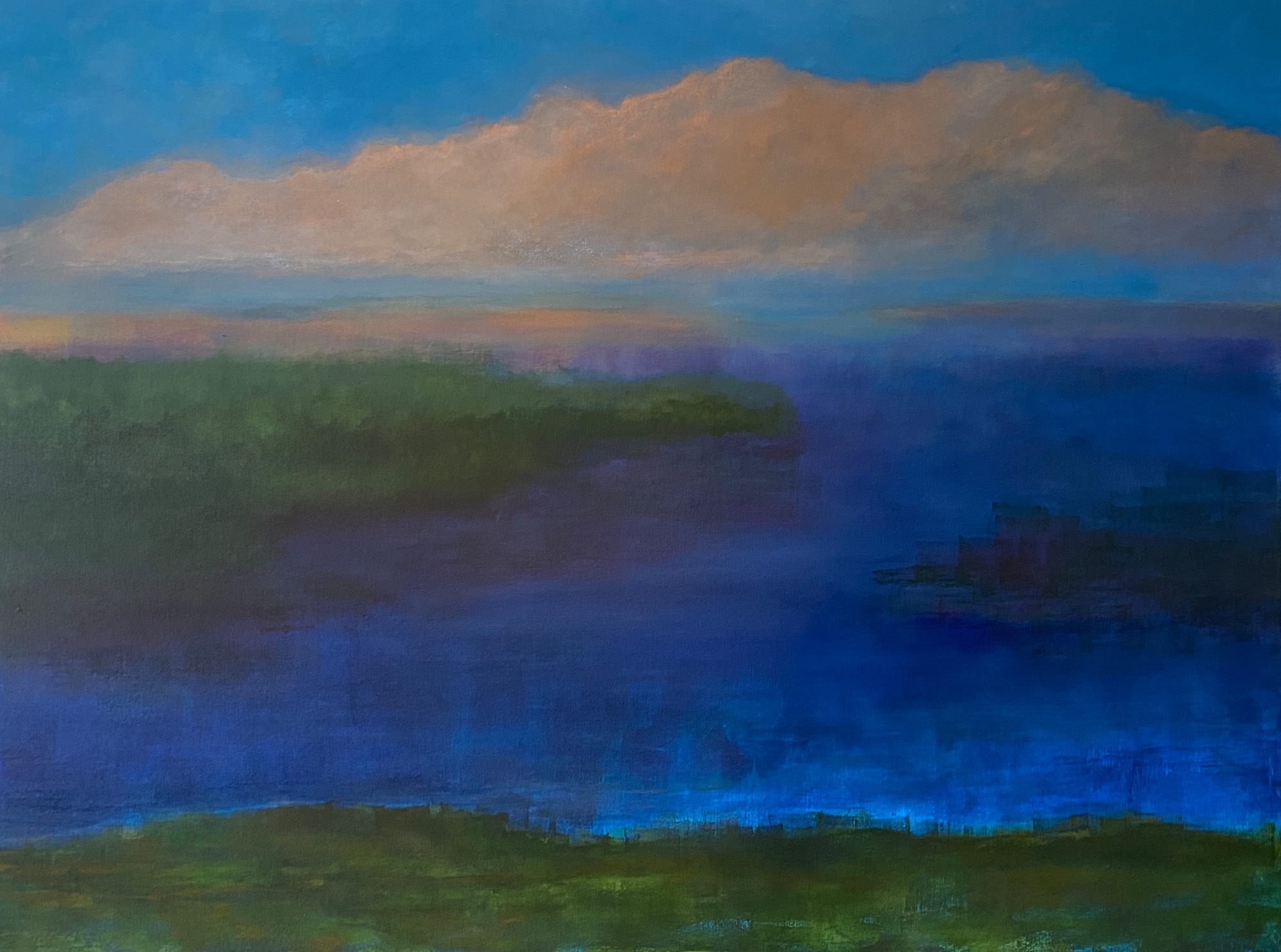 No Freeways just a watery landscape between you and home. This painting holds some memories of the waterways of Japan. The sky in this painting was revised July 2021. The previous version in shown in the second image. The price includes a maple floater frame.