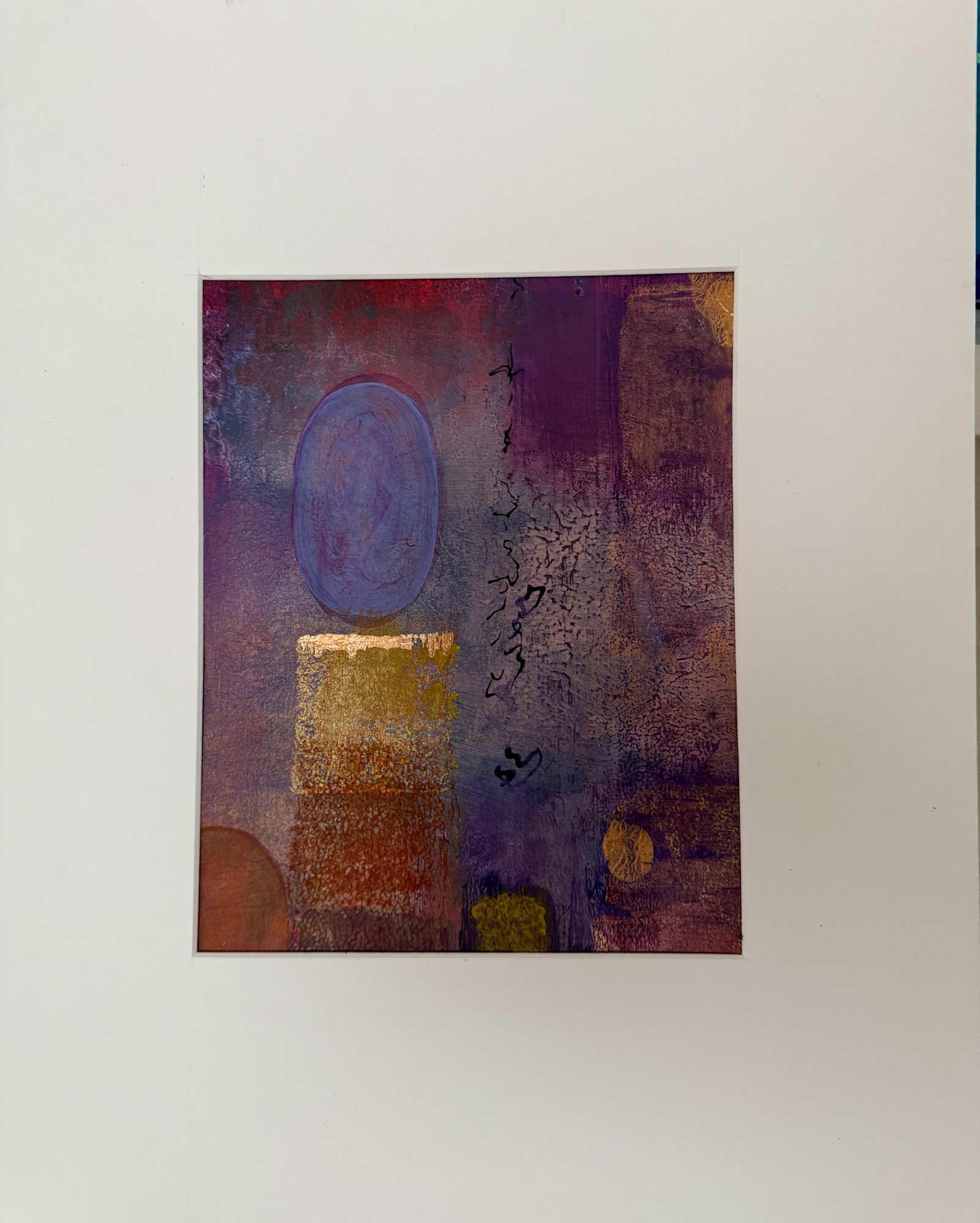 Painting is matted and framed behind glass.