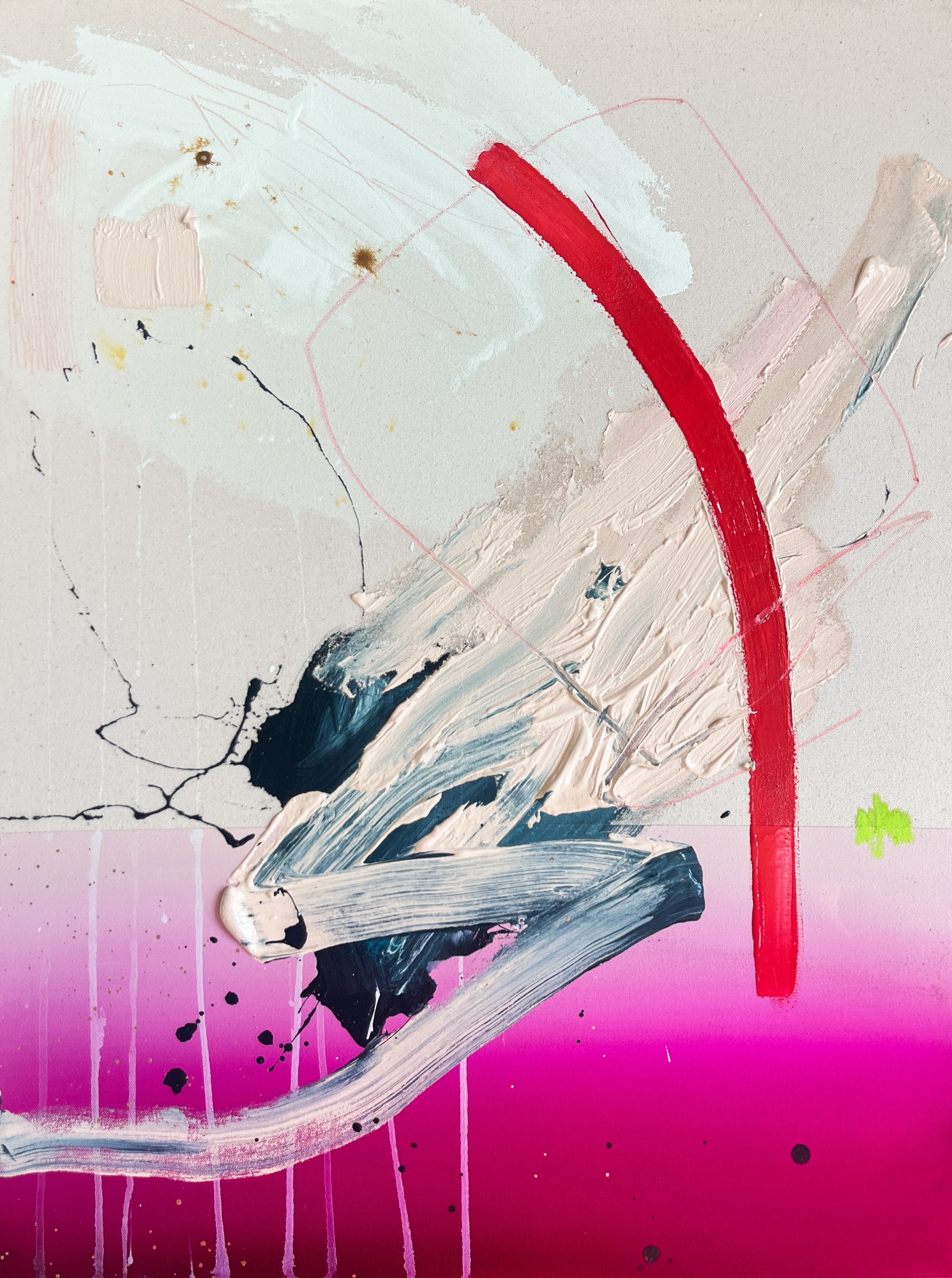 I have been experiencing major life changes. I am closing a beautiful chapter and eager to open a new one. So much loss and so much unrealized gain all in one fell swoop. This piece comes as the first after a long, much-needed sabbatical from painting in the studio. I needed to enrich my soul, focus on my feelings, and move towards something new. While this work is clearly me, it also embodies a sense of control, and a delicate balance of neurotic meticulousness with unfettered freedom. Its layered shifts in refinery are emblematic of my deeper experience through this time of extreme transition.