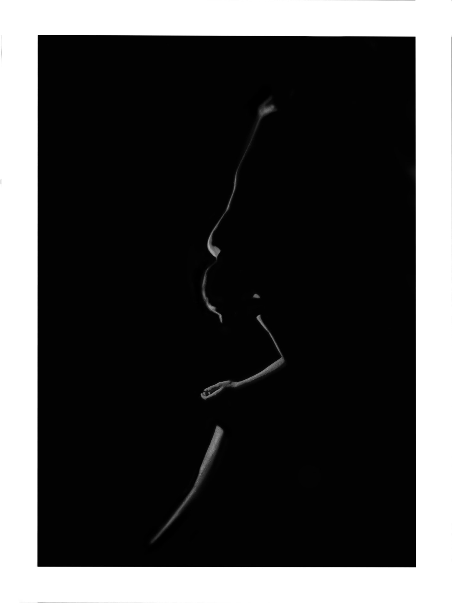 A white outline of a girl against a black background. The light silhouettes her face, arms and legs. The dark shadows carve shapes into her form giving the most basic outline of her stance. The girl leans forward with her left leg crossed in front of her, her left arm held in front of her body, and her right arm thrown high above her head, twisting as far back as it will go.