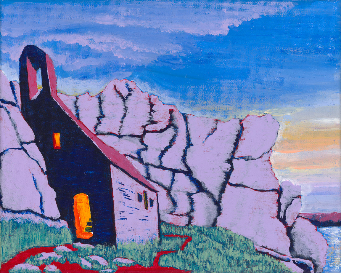 A chapel hugs the side of a cliff with a serene sky overhead. A crimson footpath flows to the doorway where a warm light draws the viewer up the stairs within.