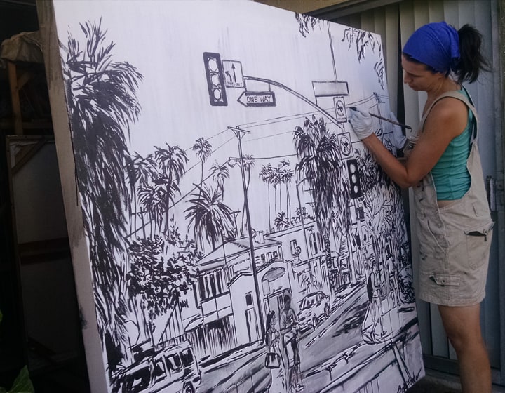Based in Los Angeles, CA, I paint cityscapes & coastal scenes that record the connections between people as witnessed in a moment.