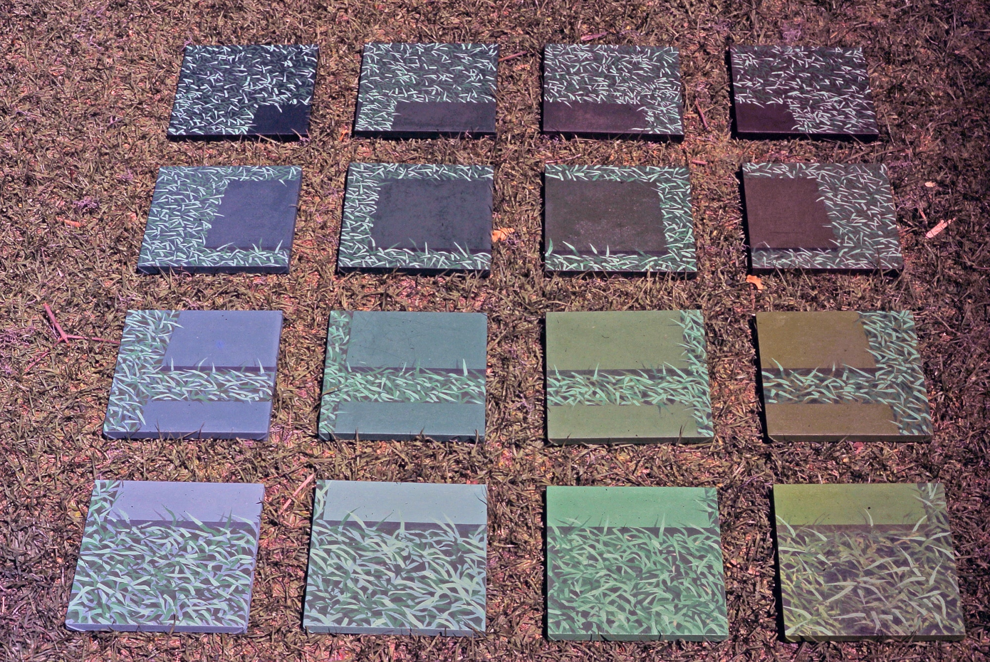 16 canvases, 12' X 12", displayed on grass, actual or artificial.