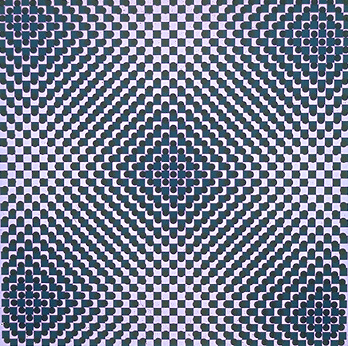 This was part of a series. Handcut(!!) stencils, two patterns, one of squares one of circles, each with a slightly different measure. Perhaps one 1/8", the other 5/32". I used the same screens for a variety of color palettes.