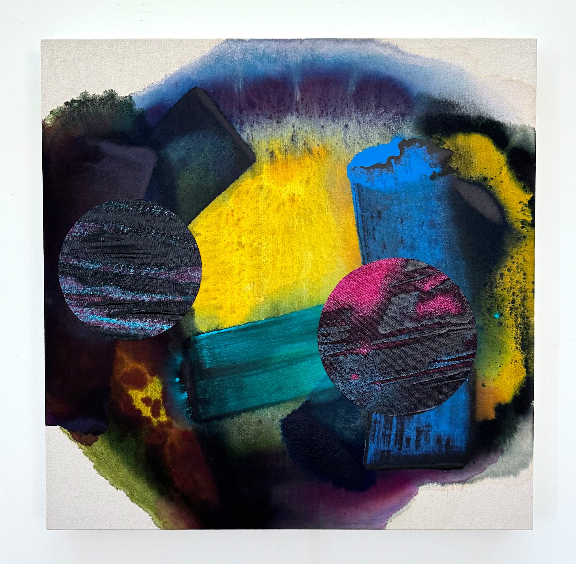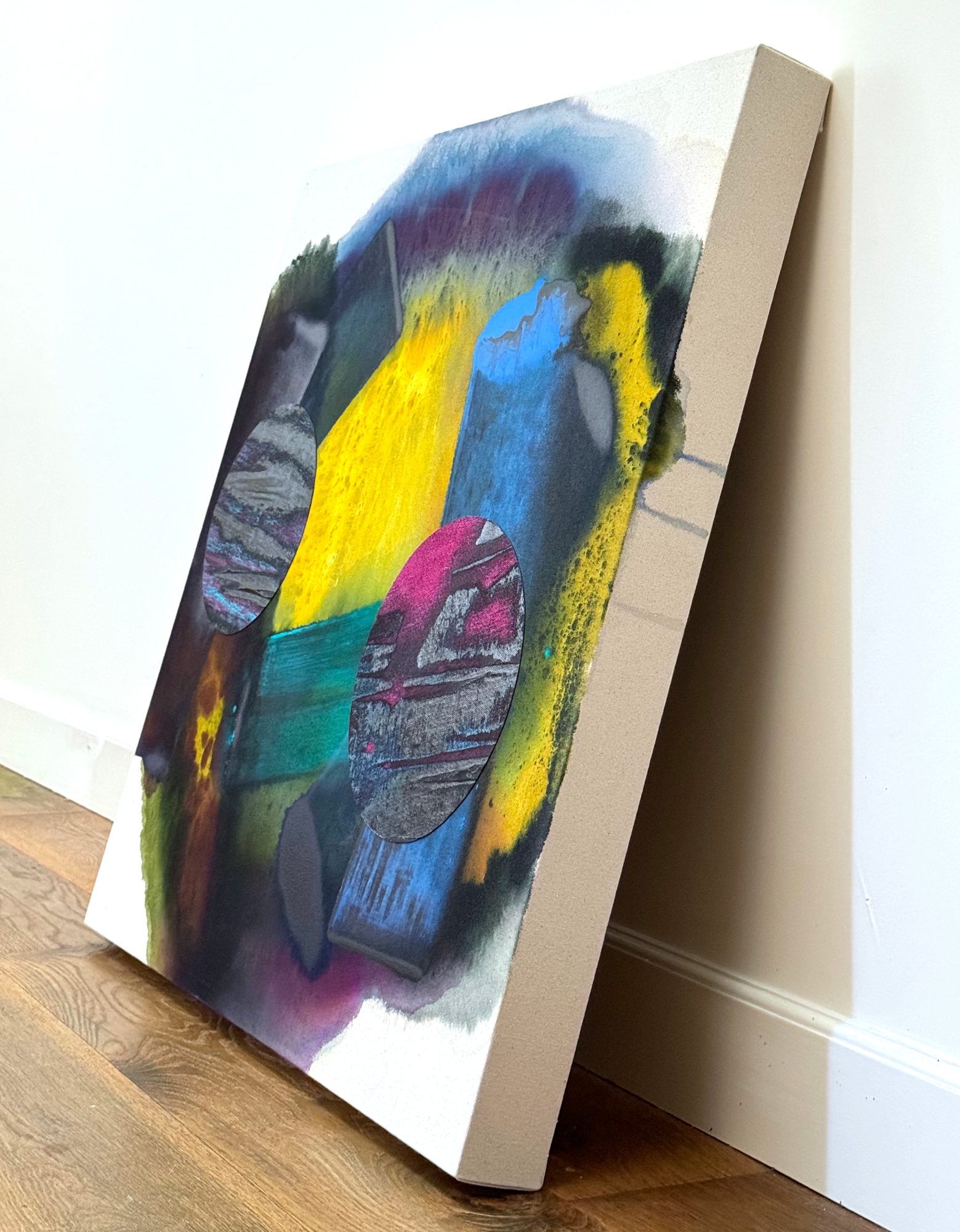 raw pigment, polymer emulsion and dyed linen on raw canvas