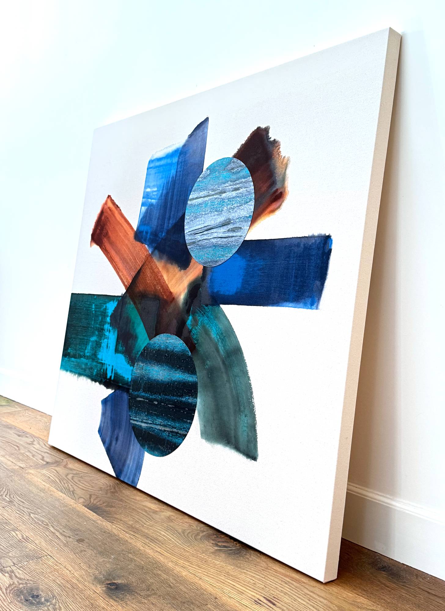 raw pigment, polymer emulsion and dyed linen on raw canvas