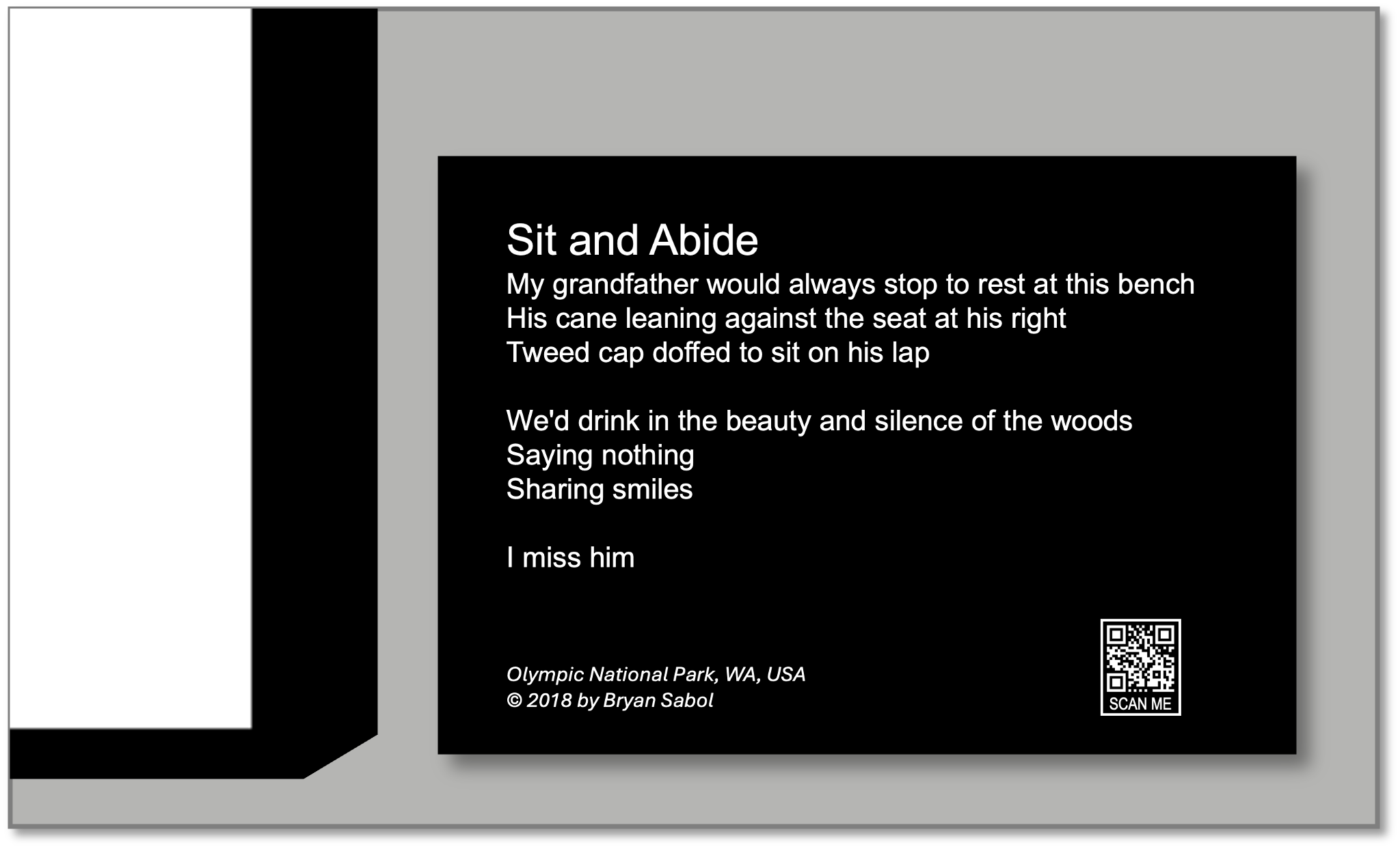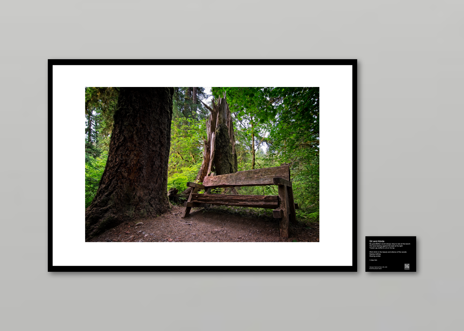 This photograph of a decaying bench and stump in Olympic National Park, WA, USA, is available as a 16”x24” signed limited-edition print (printed on archival giclée paper), mounted to a backing board, and framed. Included with the framed print is the accompanying narrative (shown above), which is etched into a 3.5" x 5" black acrylic plaque. Both the print and the plaque have mounting hardware attached, making them ready to hang on your wall.
