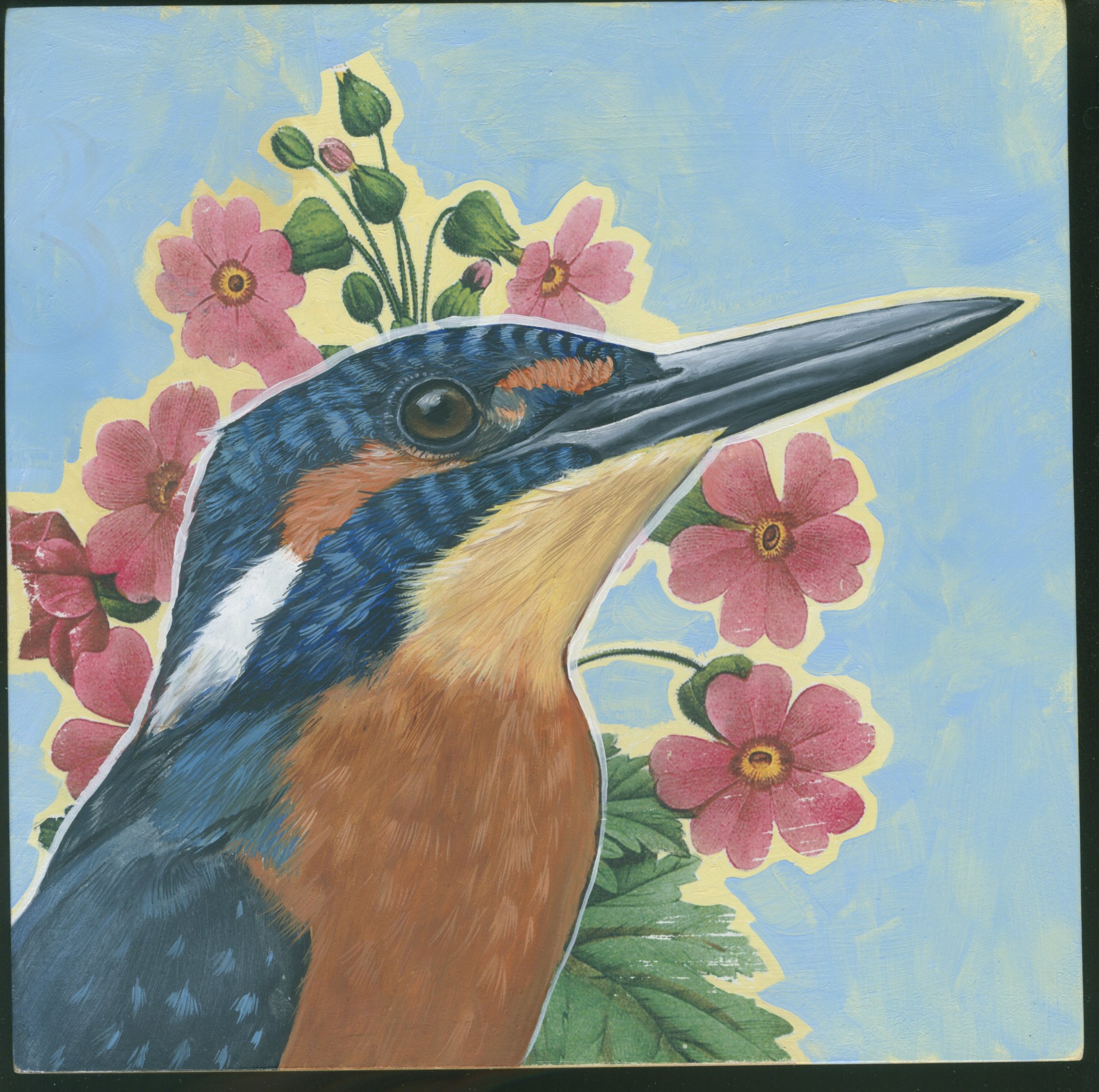 Here, a Common Kingfisher is contrasted against a background collage of flowers