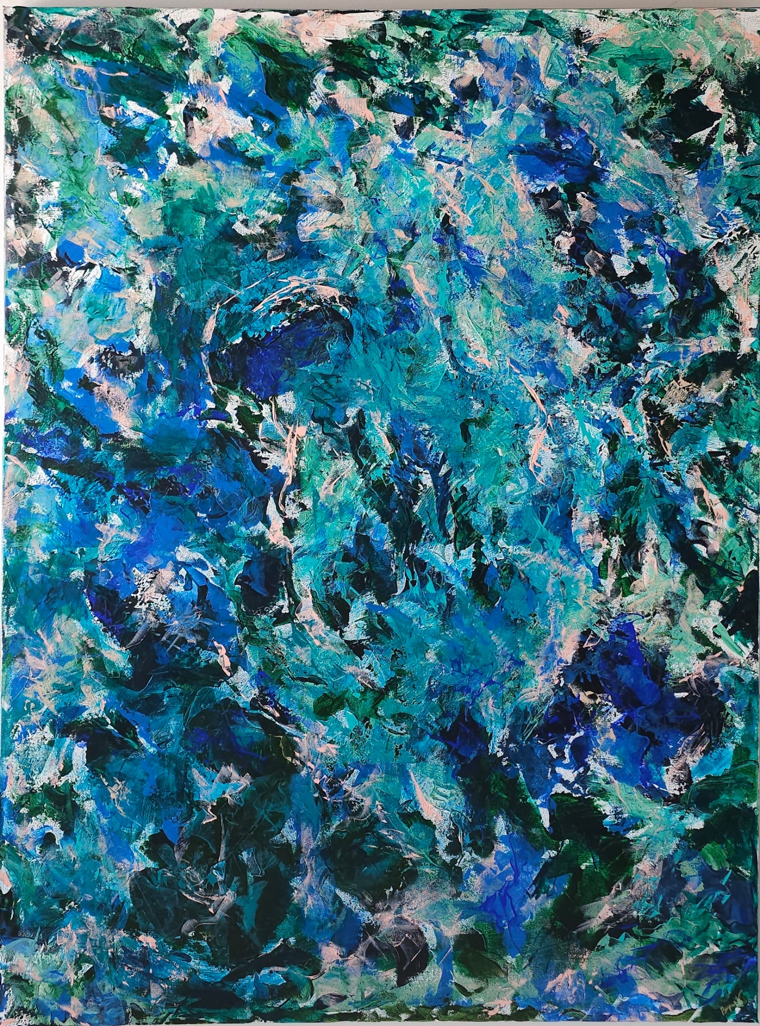 "Coastal Serenity" is an exquisite abstract masterpiece that beckons viewers into a world of tranquil maritime beauty. This work effortlessly captures the essence of the coastline, immersing the observer in a serene symphony of colors. Hues of deep oceanic blues merge seamlessly with the softest sea-greens, evoking the ebb and flow of waves against the shore. The Mossy Muse's deft brushwork creates a harmonious dance between the various shades, suggesting the gentle undulation of the tides. Wisps of ethereal white blend into the composition, conjuring images of frothy seafoam and mist-kissed seashores.