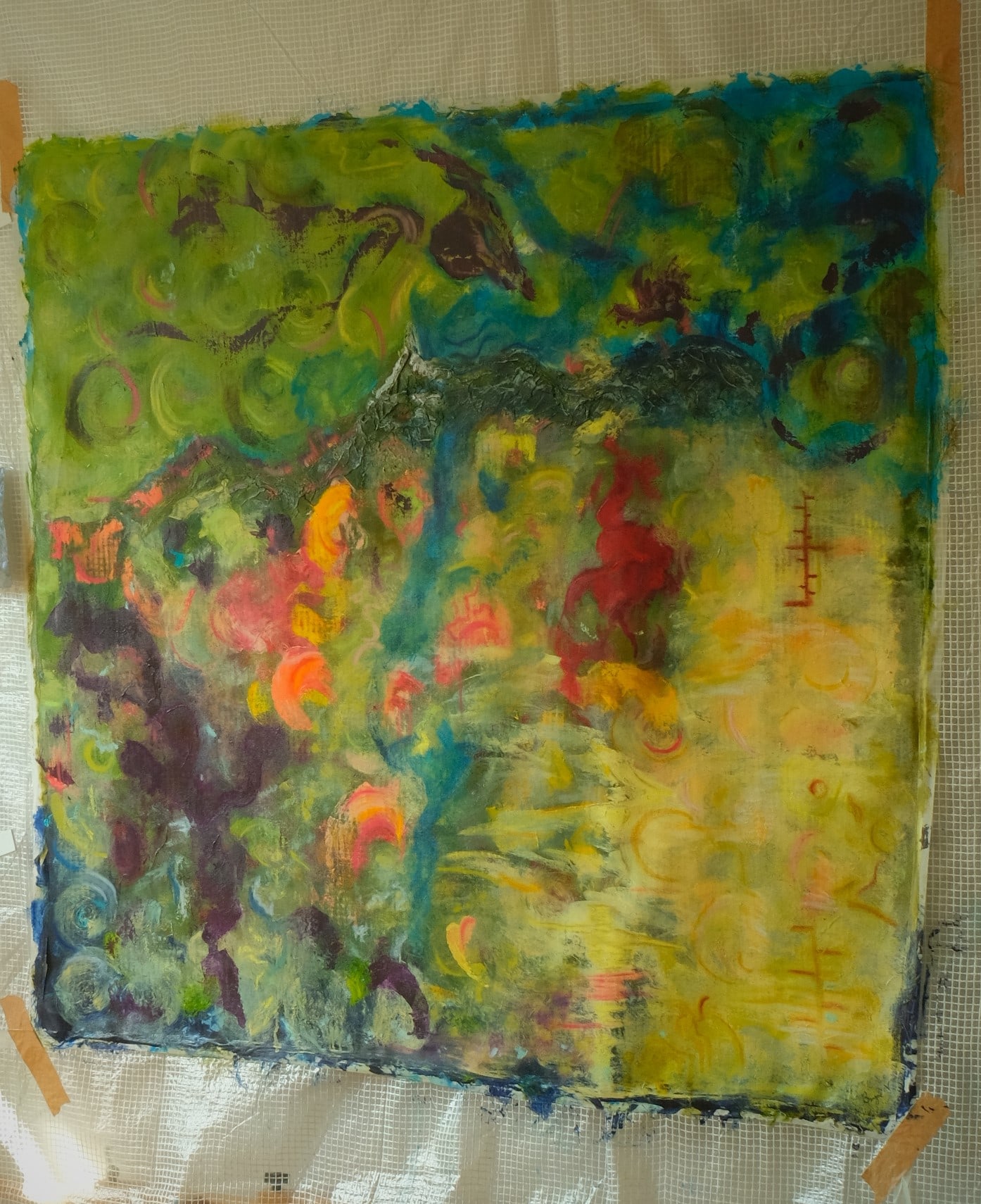 Acrylic paint, Alcohol Inks, Acrylic inks, Thinset, Oil sticks, pastels, charcoal, spray paint on unframed canvas