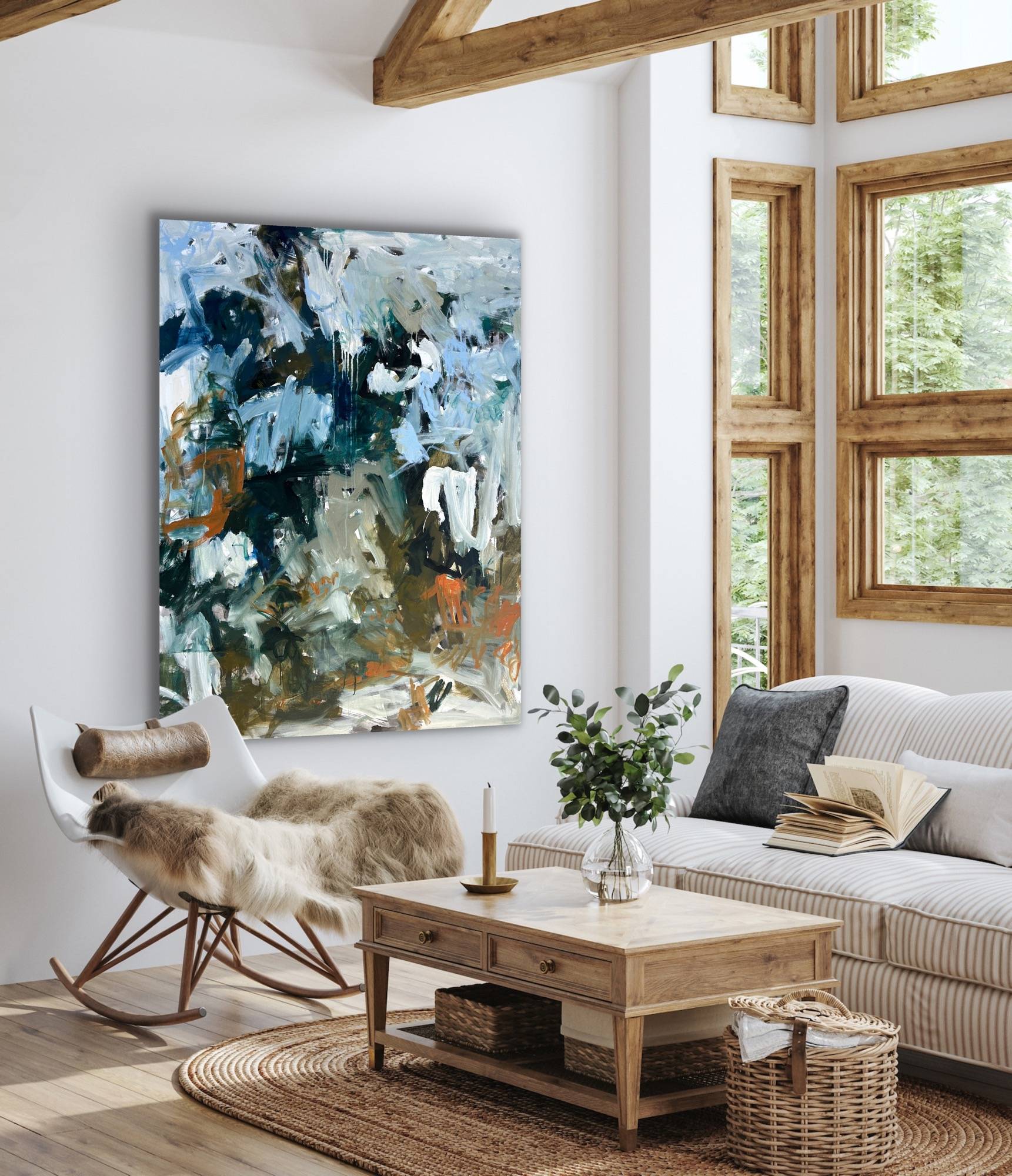 Acrylic on canvas. In a white wood floating frame. Hang horizontal or vertical.