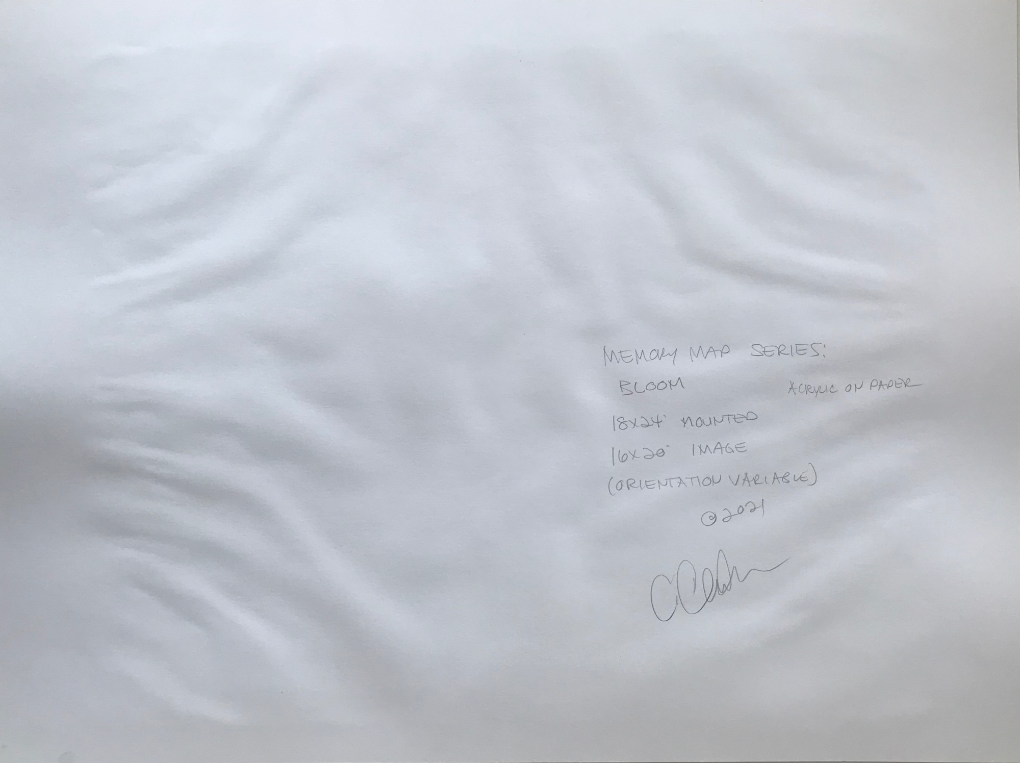 Bloom is an 16x20" abstract, acrylic painting mounted on an 18x24" soft white archival water color paper. The rich textures, range of blues and greens combined with highlights of copper and interference blue, create a quality reminiscent of an areal view of landscape .