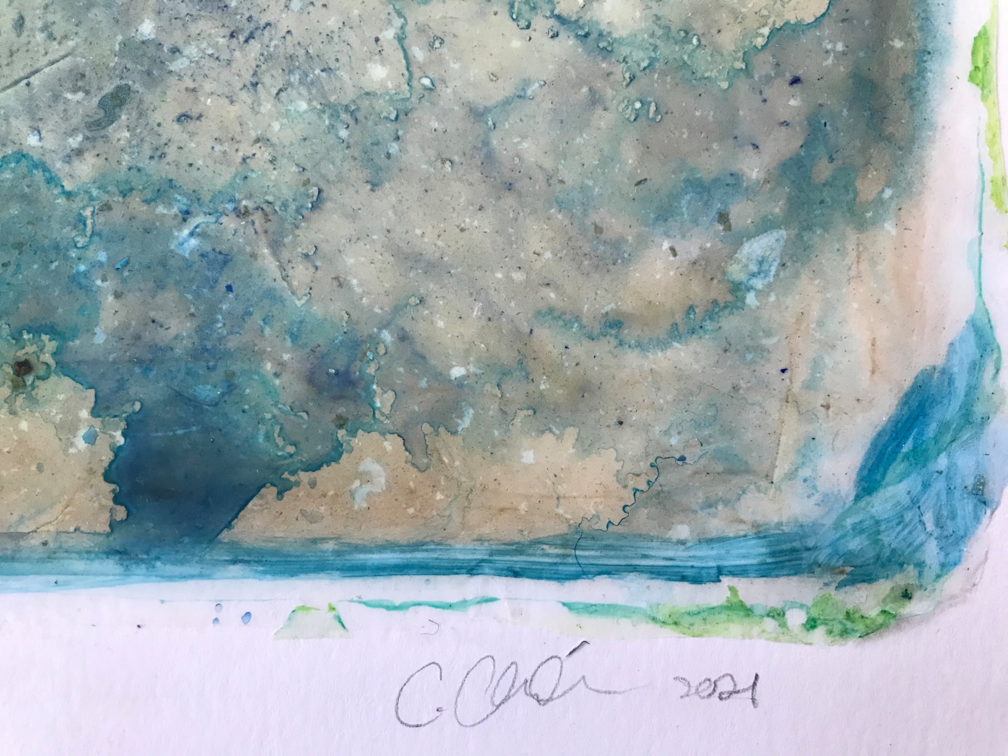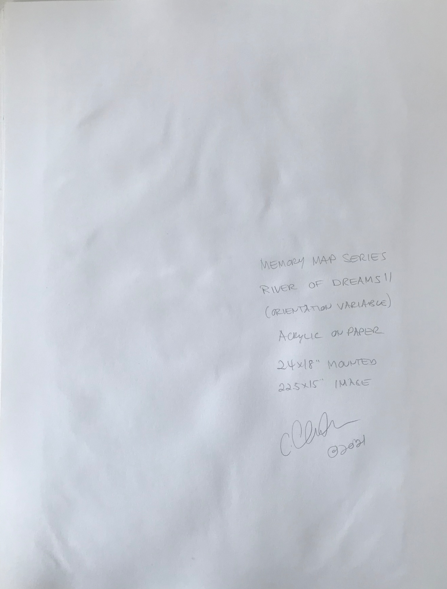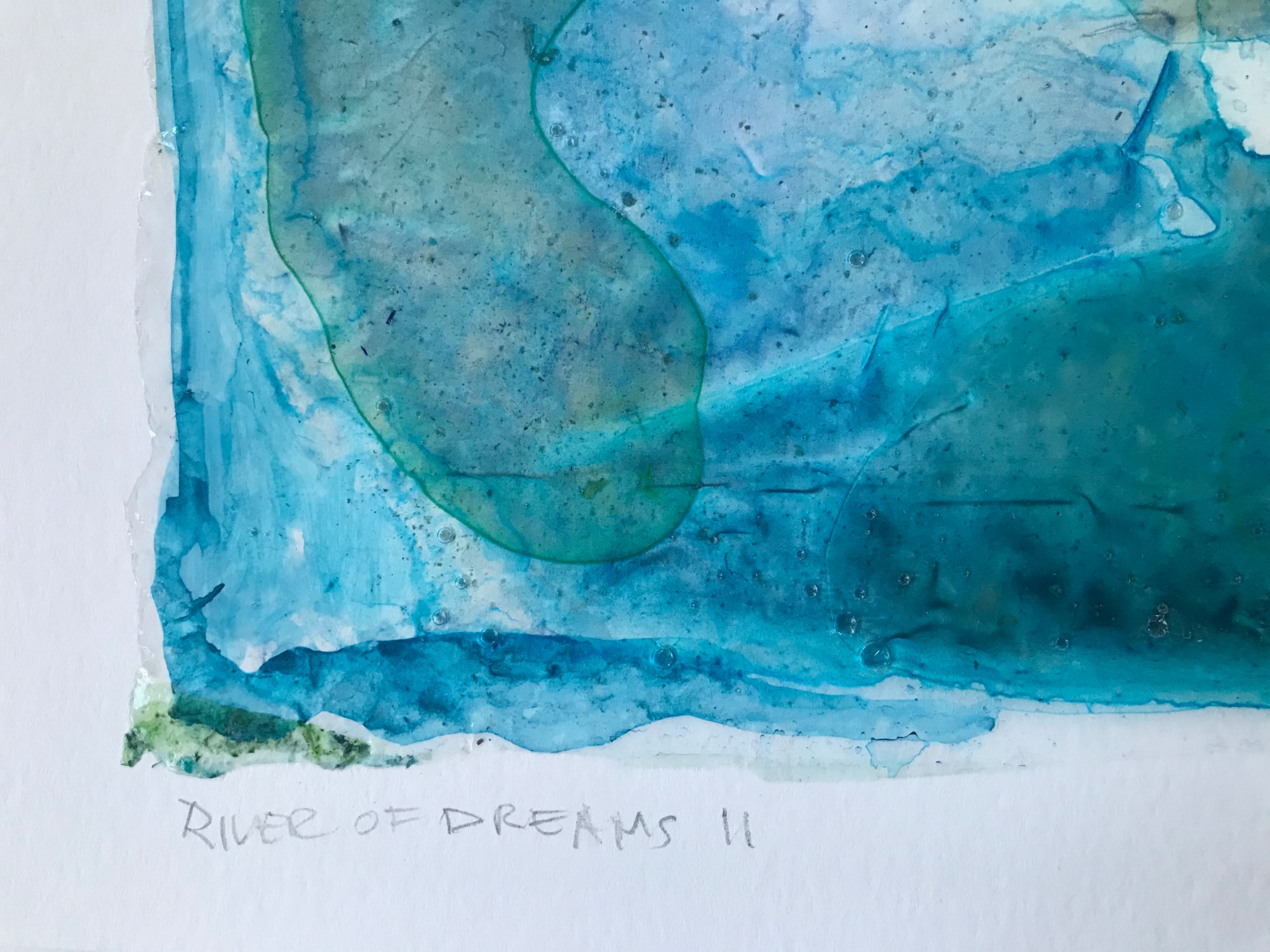 River of Dreams 11 is a 22.5x15" abstract, acrylic painting mounted on an 24x18" soft white archival watercolor paper. The rich textures, range of blues, and greens combined with light sandy earth tones create an abstract landscape quality to this image.