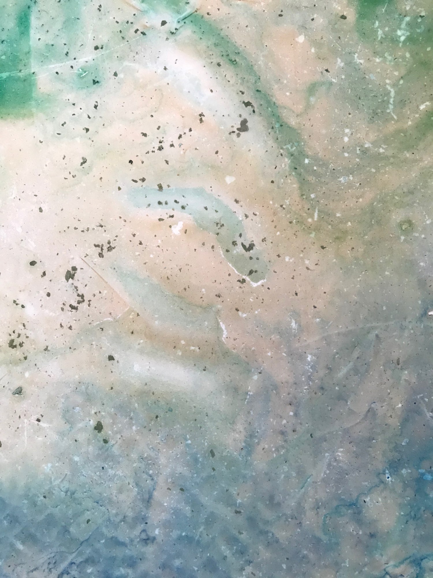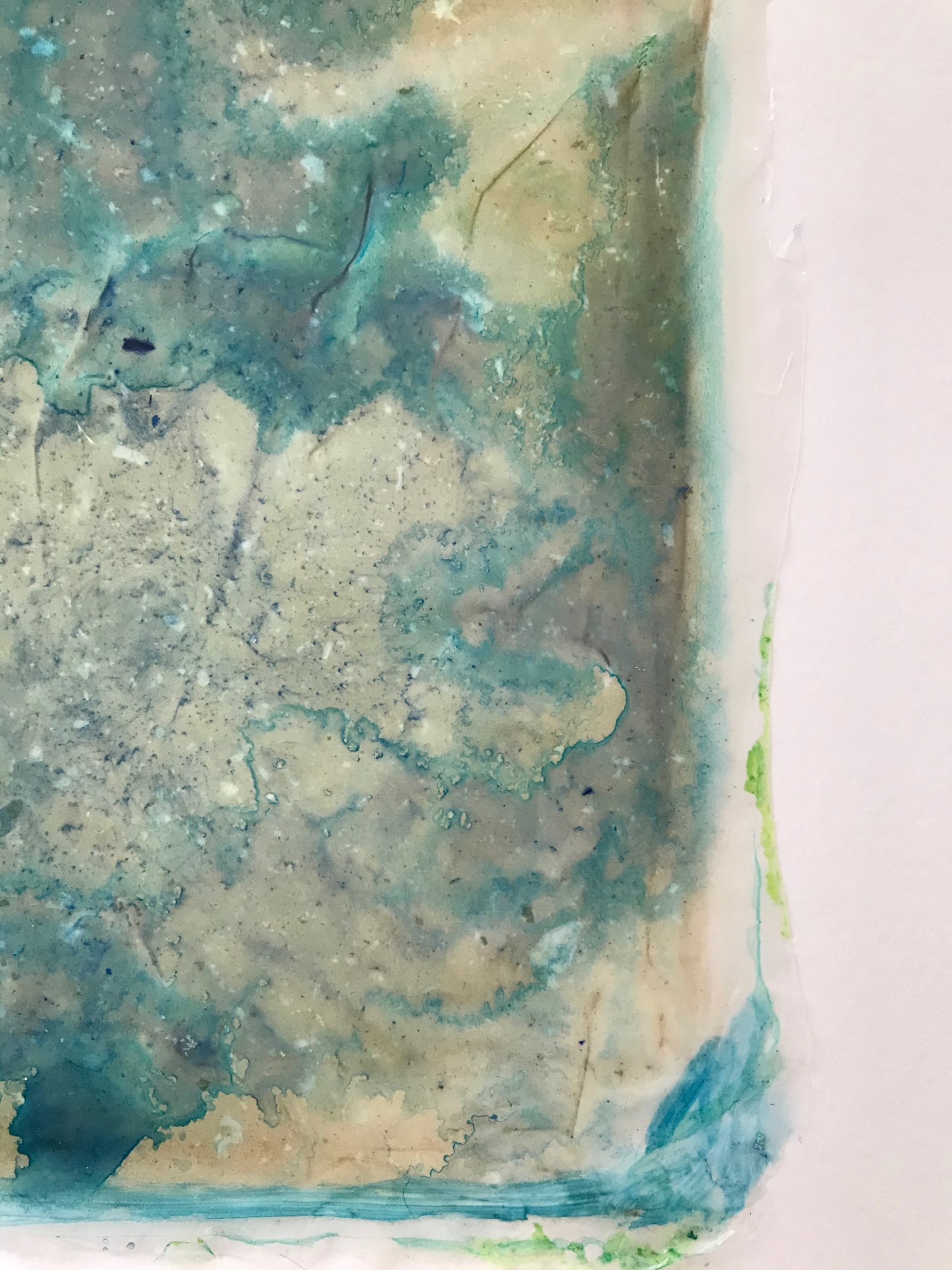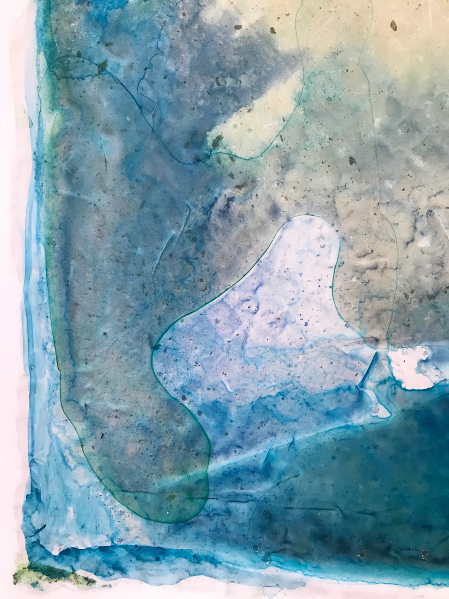 River of Dreams 11 is a 22.5x15" abstract, acrylic painting mounted on an 24x18" soft white archival watercolor paper. The rich textures, range of blues, and greens combined with light sandy earth tones create an abstract landscape quality to this image.