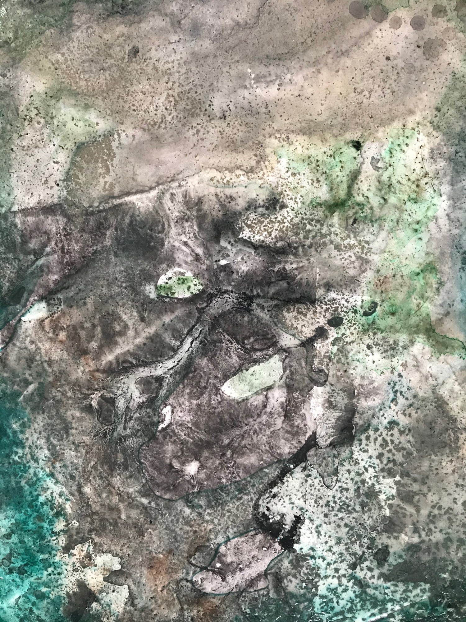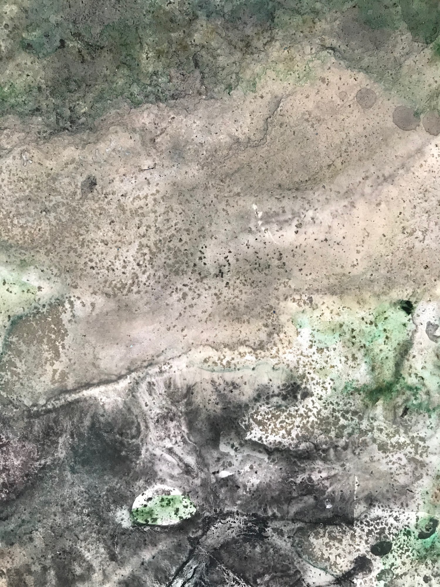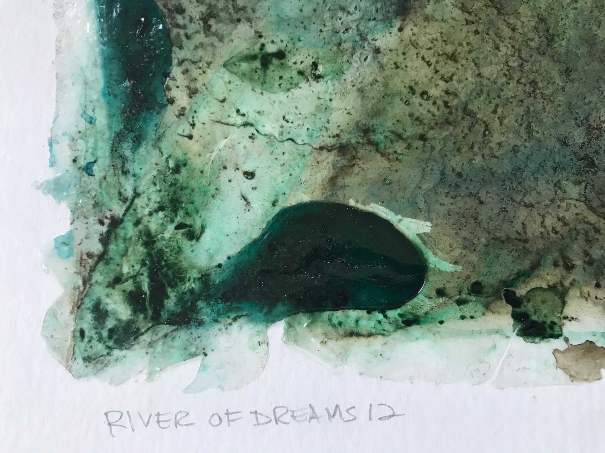 River of Dreams 12 is a 22.5x15" abstract, acrylic painting mounted on an 24x18" soft white archival water color paper. The rich textures, and deep, rich earth tones create a mysterious abstract landscape quality to the piece.