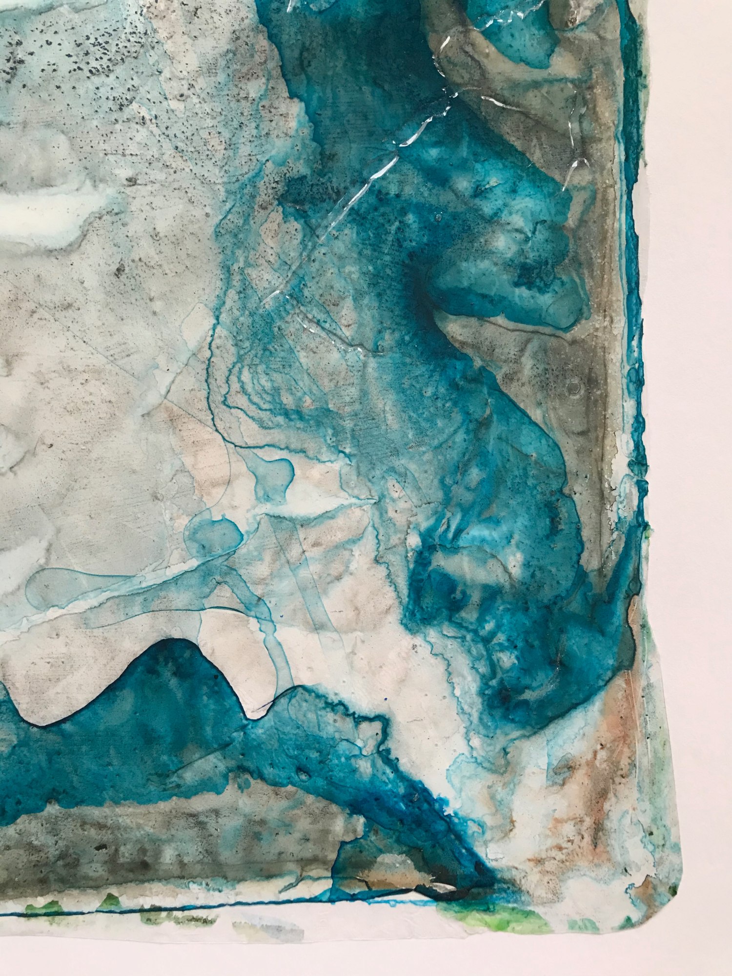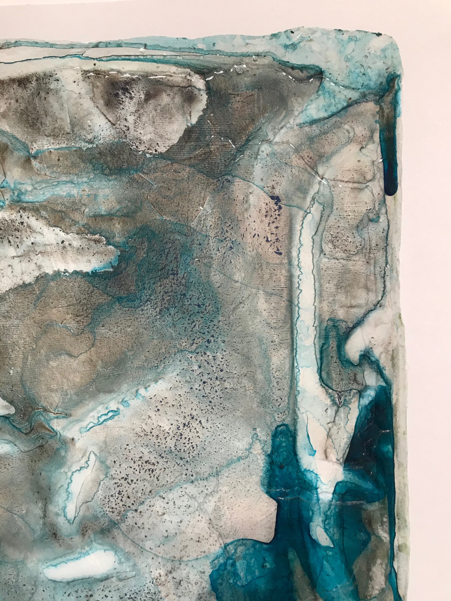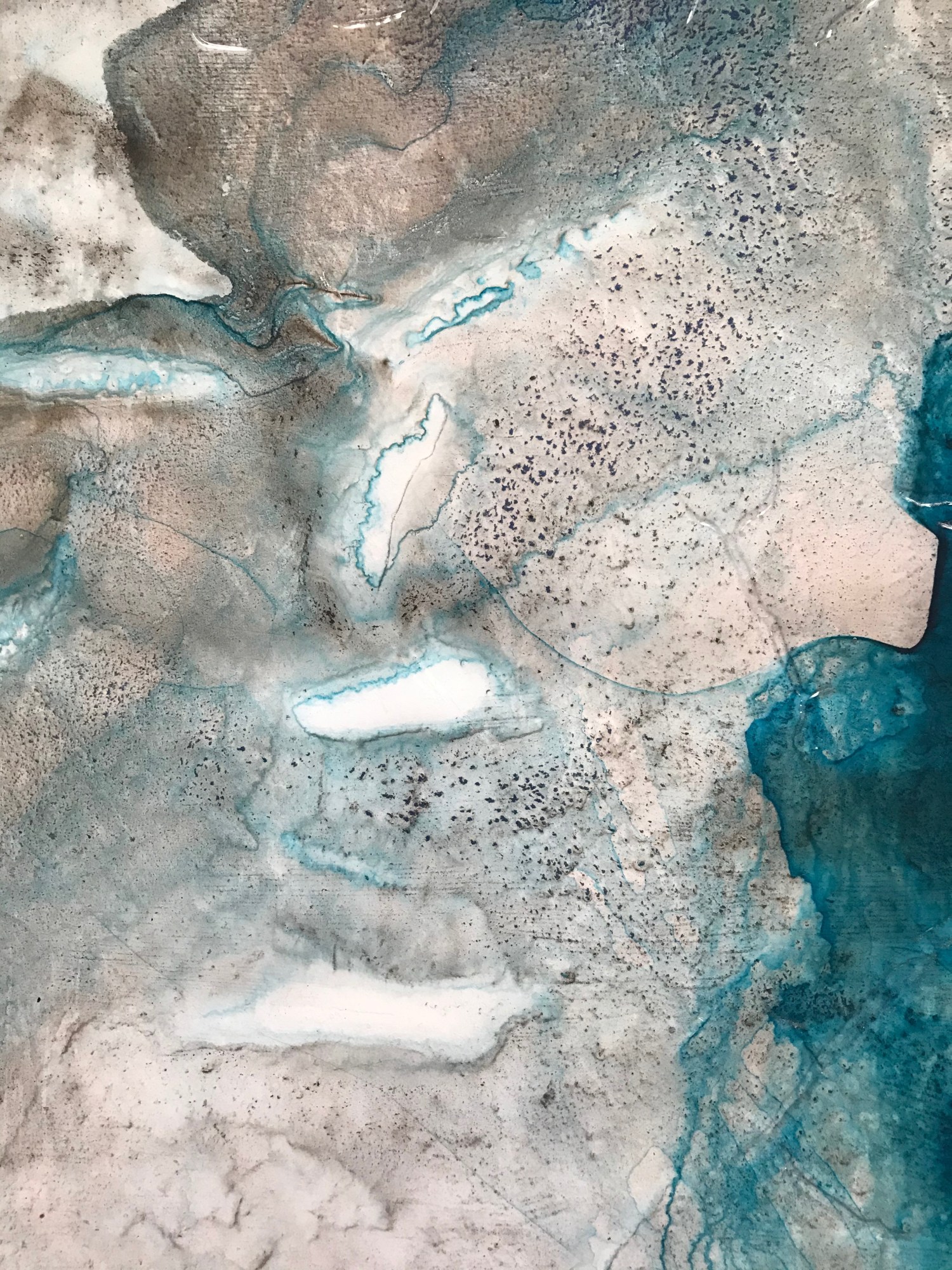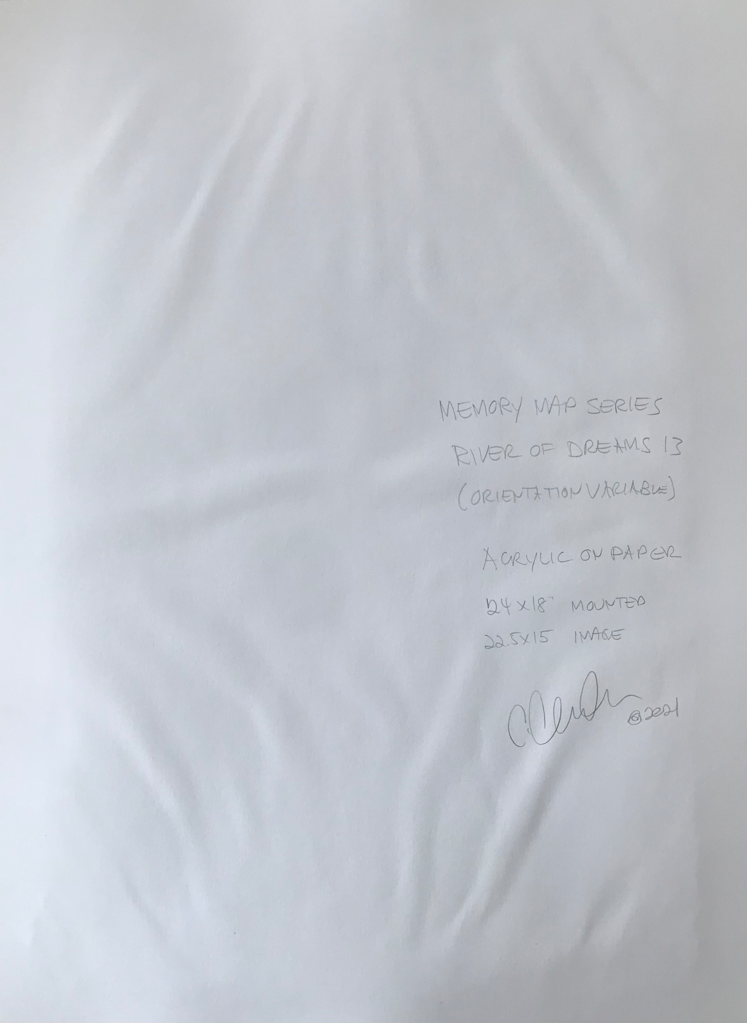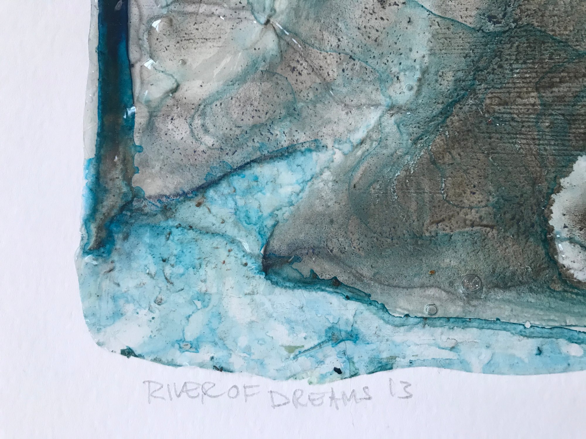 River of Dreams 13 is a 22.5x15" abstract, acrylic painting mounted on an 24x18" soft white archival water color paper. The rich textures, range of blues combined with earth tones create a mysterious abstract landscape quality to the piece.