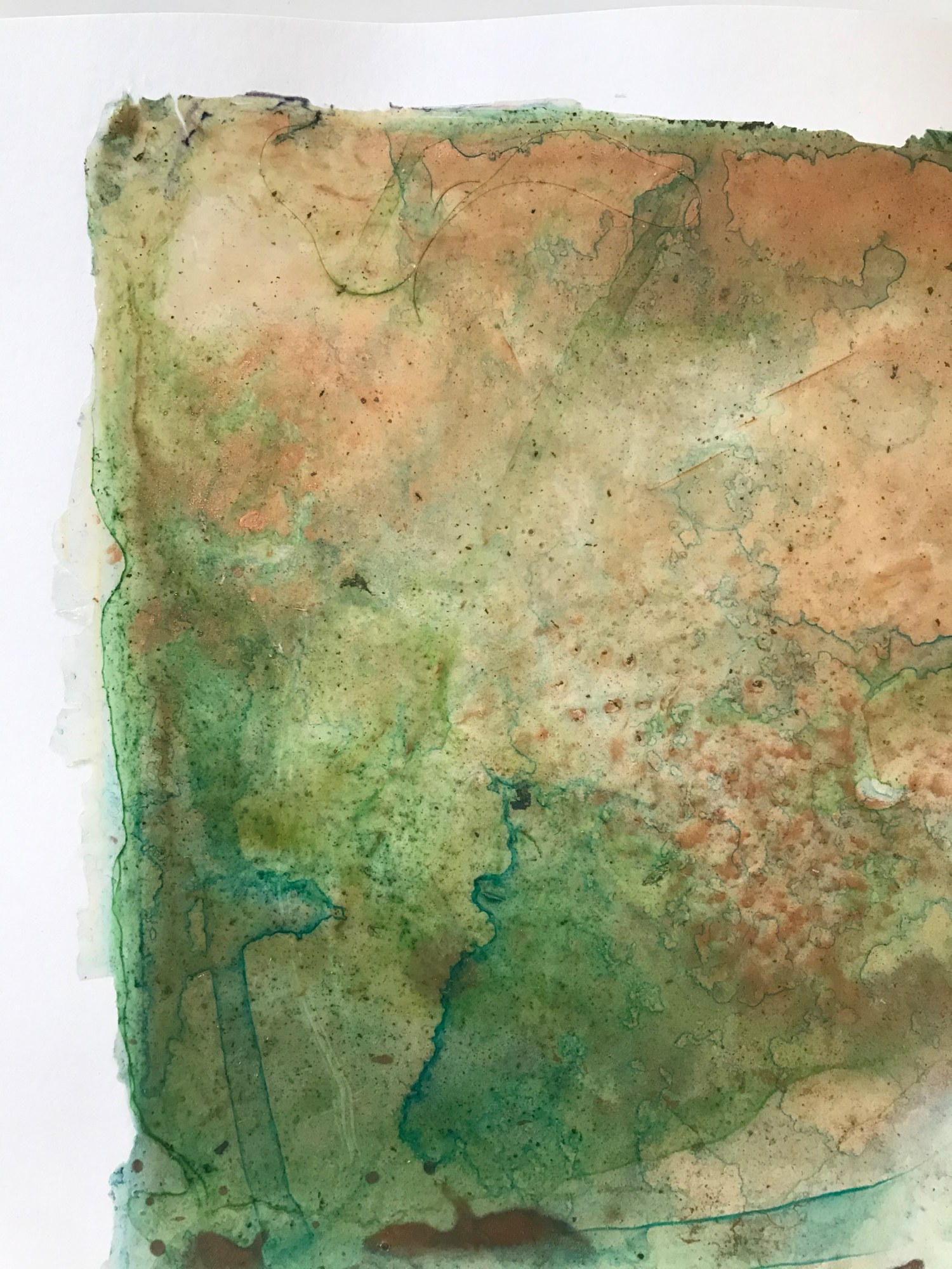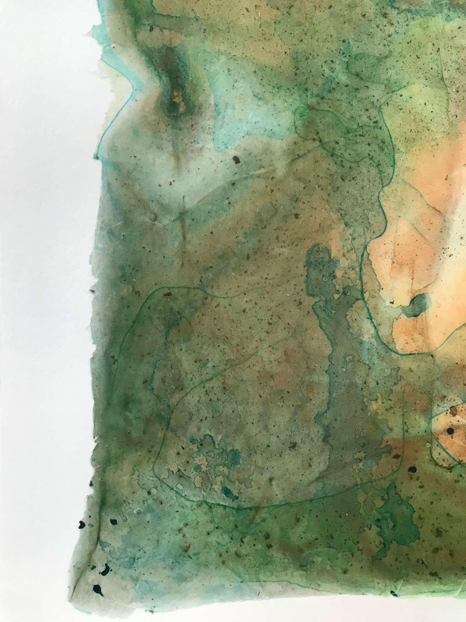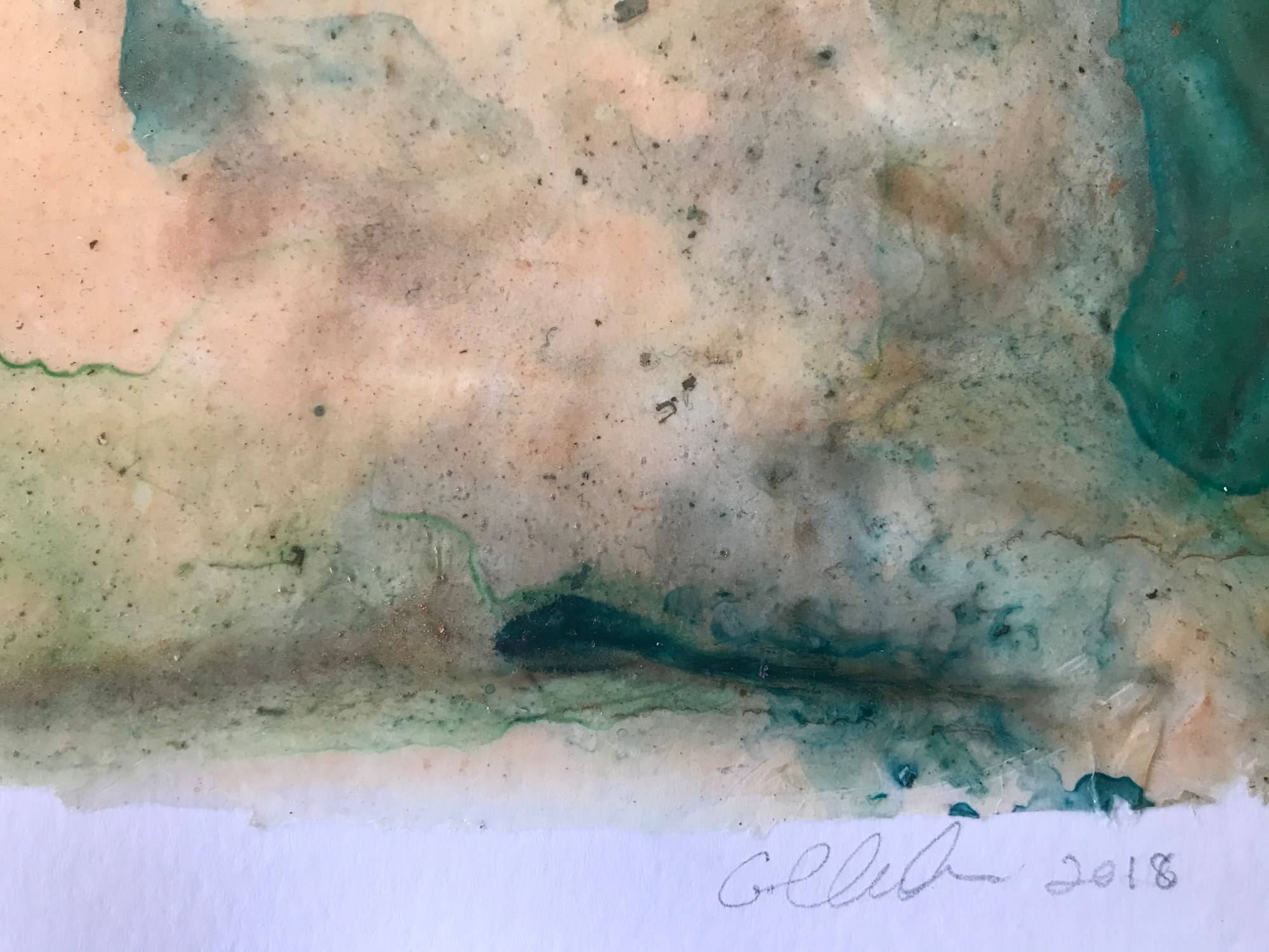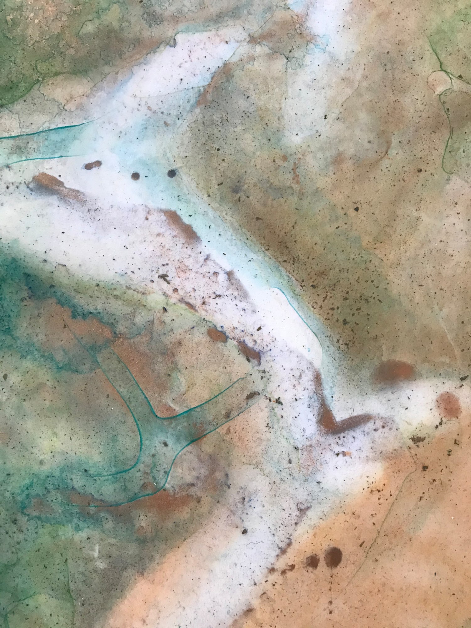 River of Dreams: Totem is a 22.5x15" abstract, acrylic painting mounted on an 24x18" soft white archival water color paper. The rich textures, range of blue-green combined with earth tones create a mysterious abstract landscape quality to the piece.