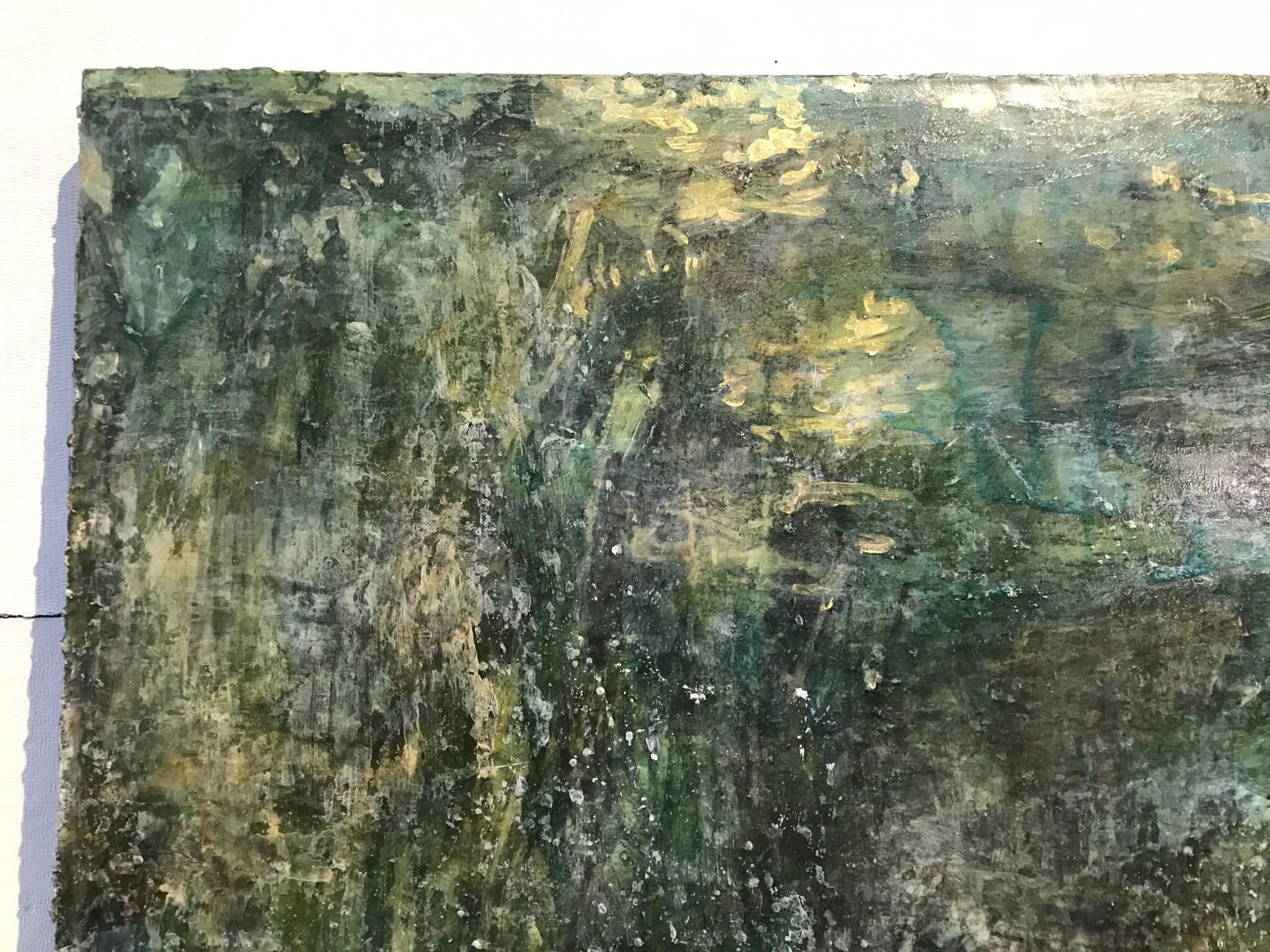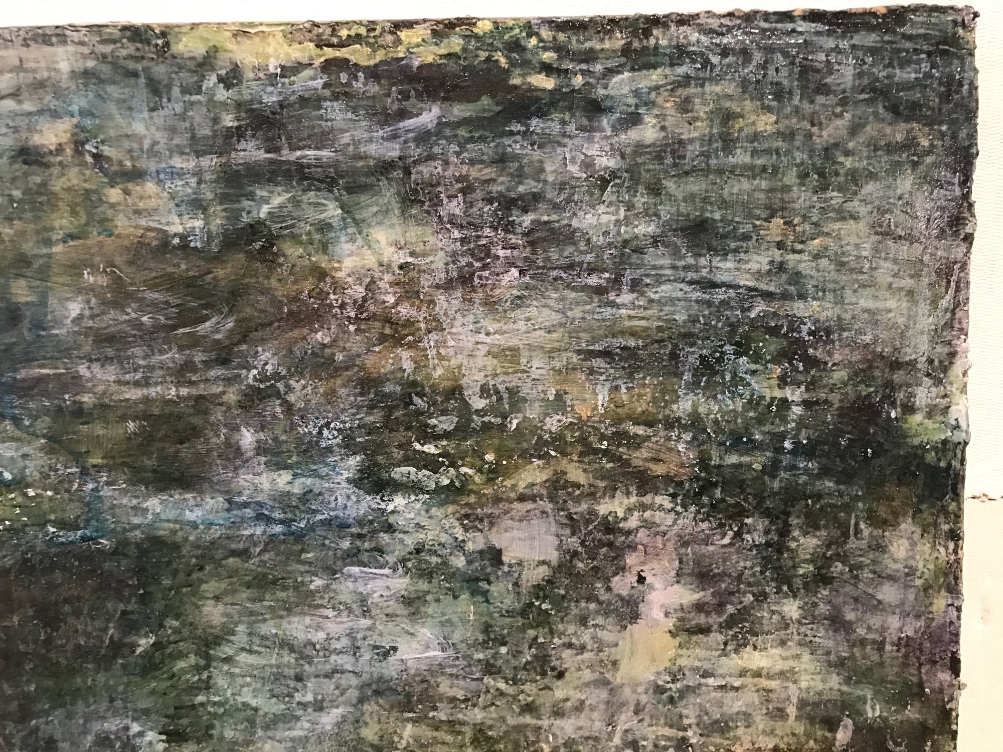 C. Clinton's acrylic painting 'Stepping Back to Go Forward', is a 40 x 30 inch abstract painting in the deep greens, blues and earth tones of a densely shaded forest. From Clinton's 'Intuitive Navigation' series, this body of work is a developing story about memory, reflection and the passage of time. This acrylic painting on canvas is oriented vertically, unframed, and signed on the reverse.