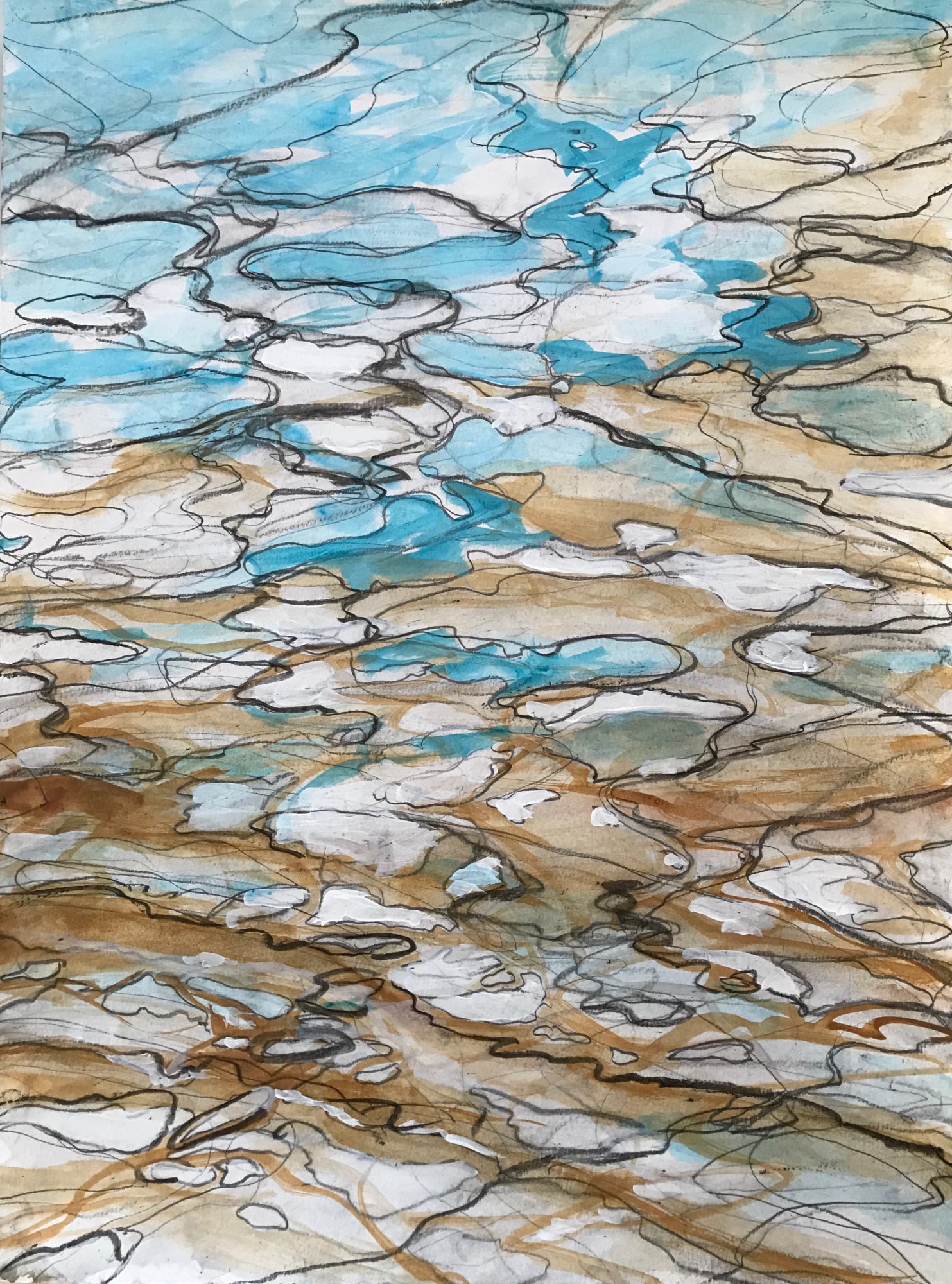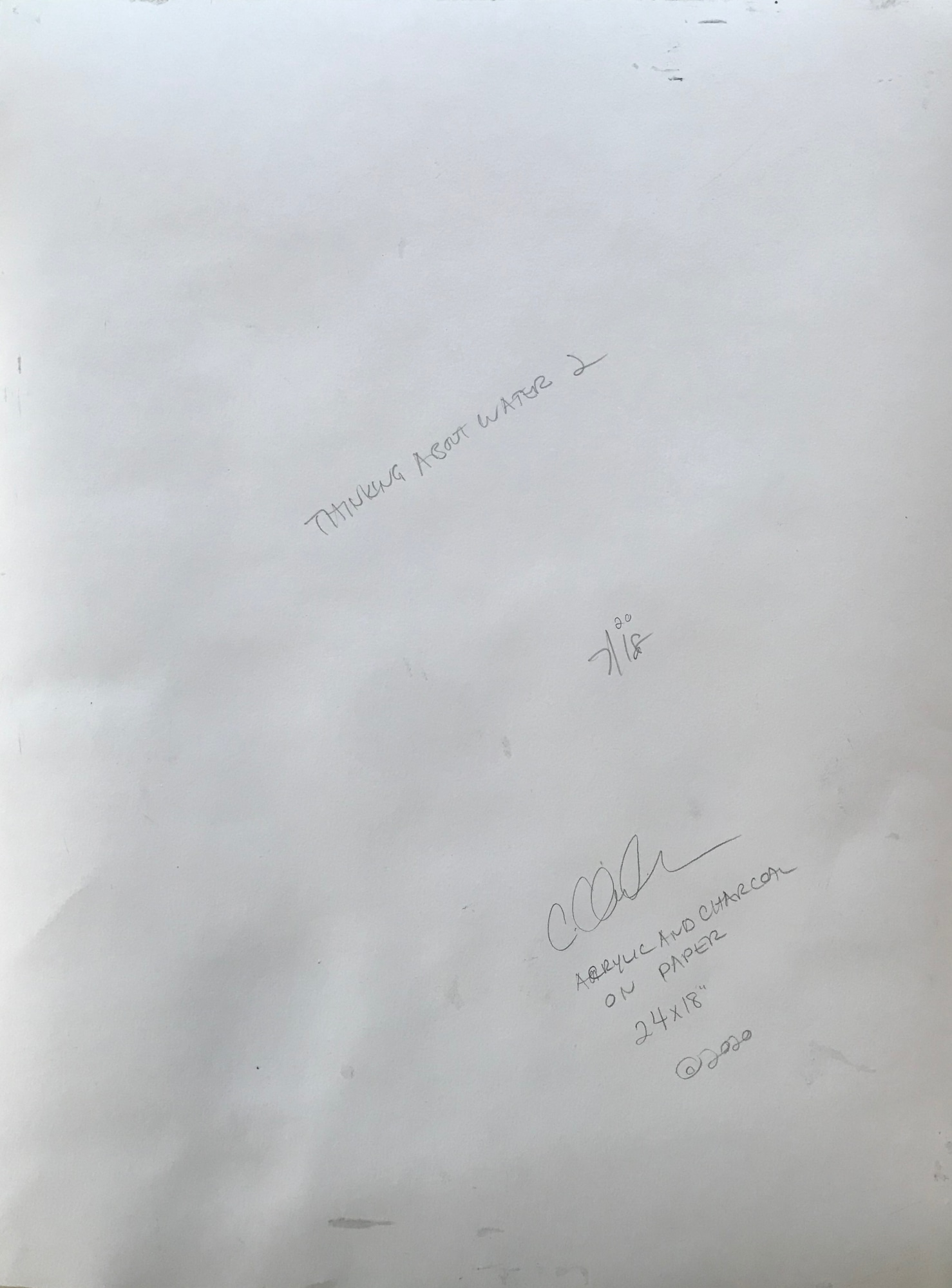 Thinking About Water 2 is a fresh, contemporary take on landscape painting that explores subtle variations of color and transparency reflected as abstract forms. This 24 x 18 inch acrylic painting on watercolor paper is part of the artist's ongoing exploration of water inspired by the colors of New England’s seasonal transitions, as reflected in the waters of a brook beside the artist's home. The painting is unframed, and signed on the reverse.