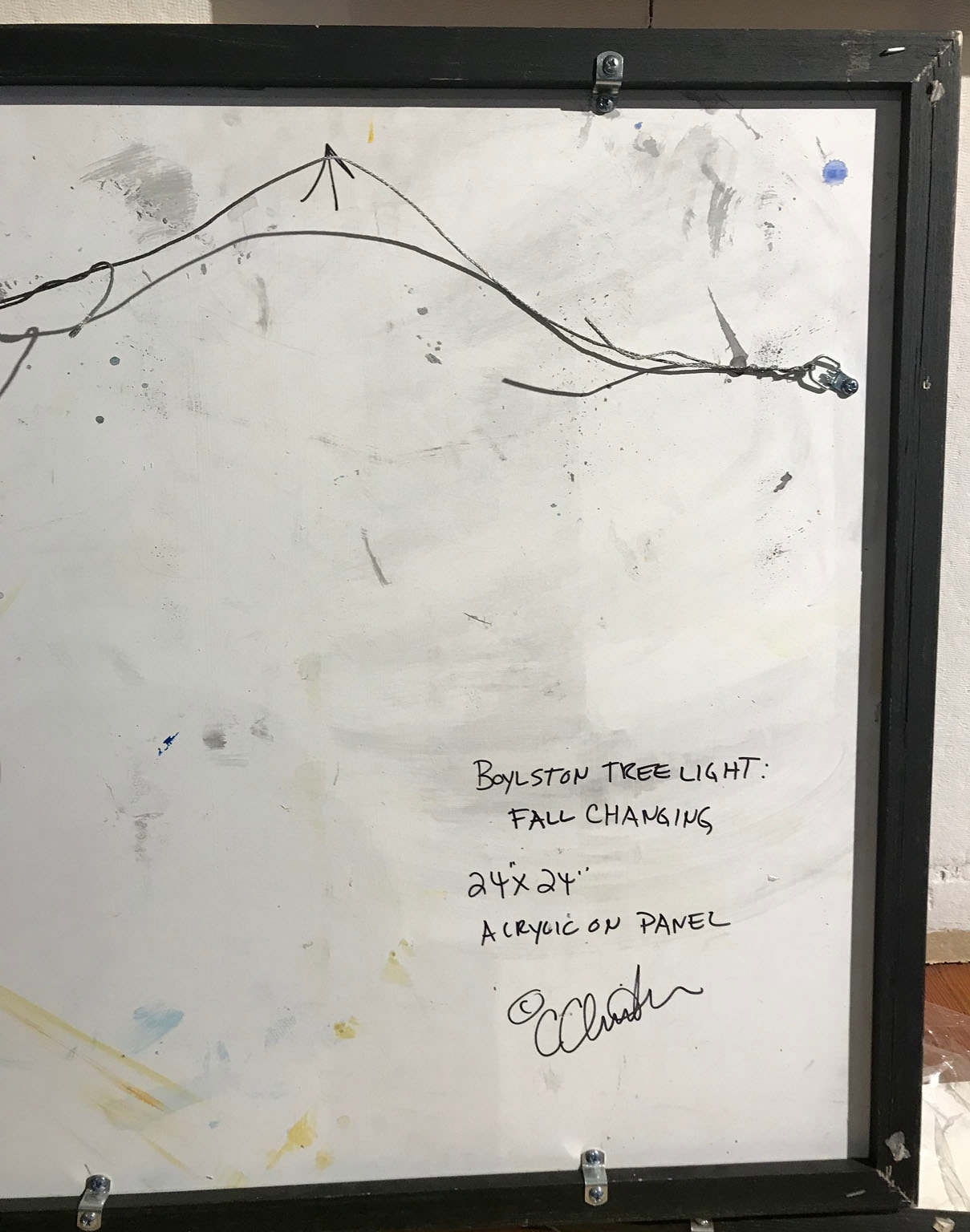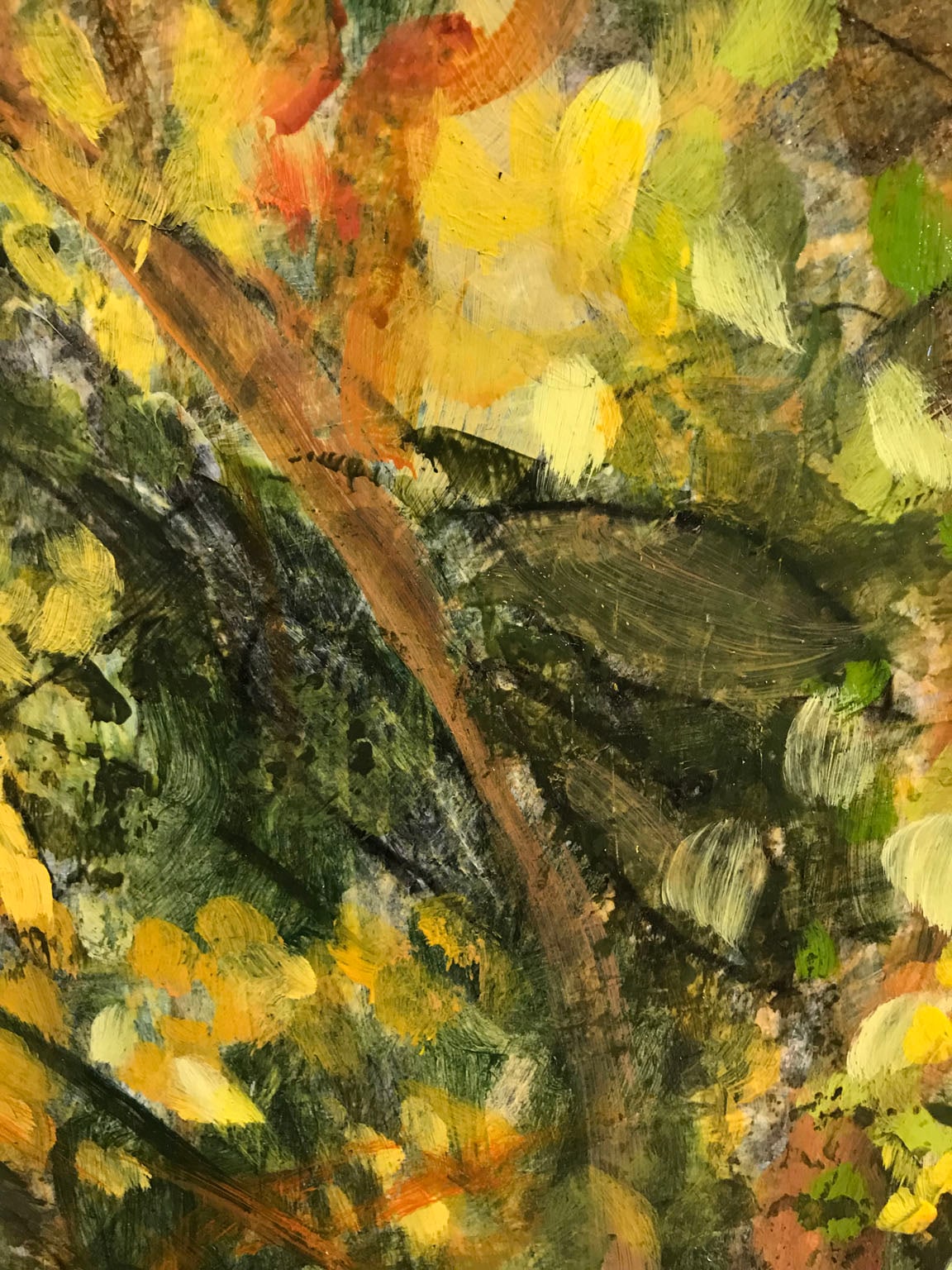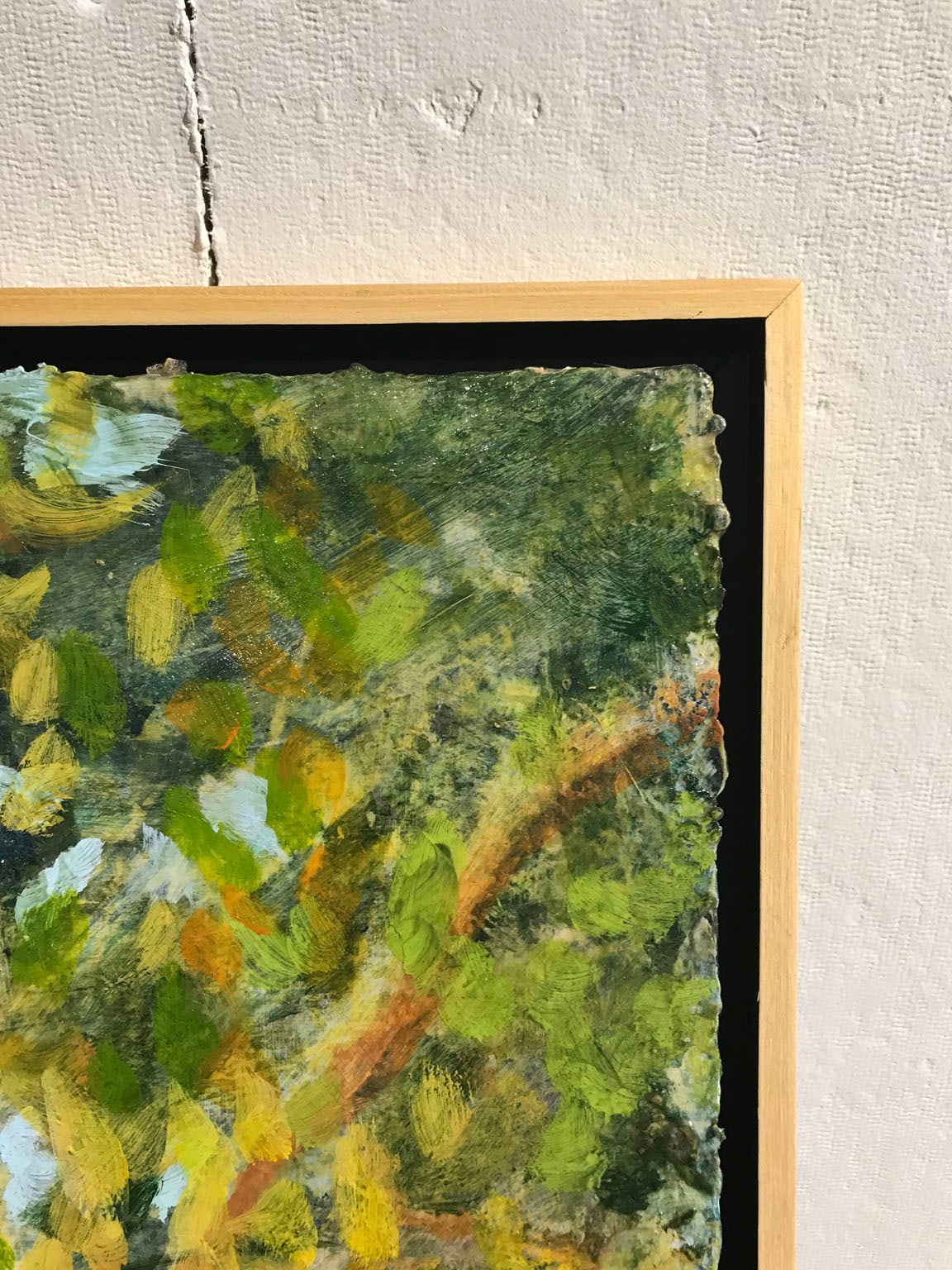 “Fall Changing” is from an ongoing series of paintings inspired by the shifting colors and changing contours of summer’s transition to autumn and autumn to winter. This 24 x 24 x 0.5 inch acrylic painting on panel traces the green of summer fading to gold with sparks of orange and hints of blue sky peeking through the tree tops. The painting is signed on the back and framed in a natural wood floater frame with black interior. Framed dimensions are 27 x 27 x 1.5 inches.