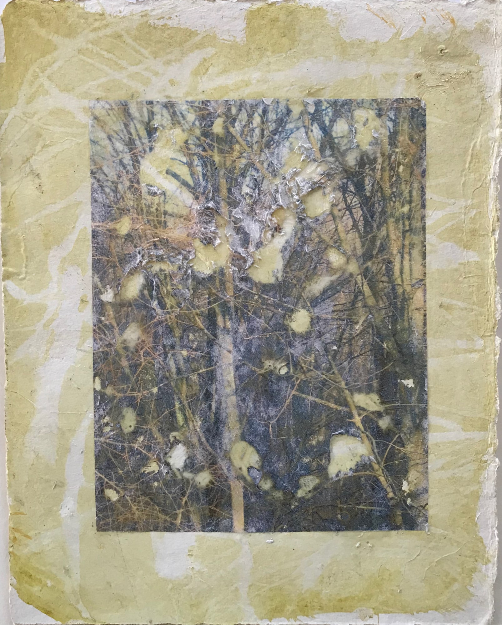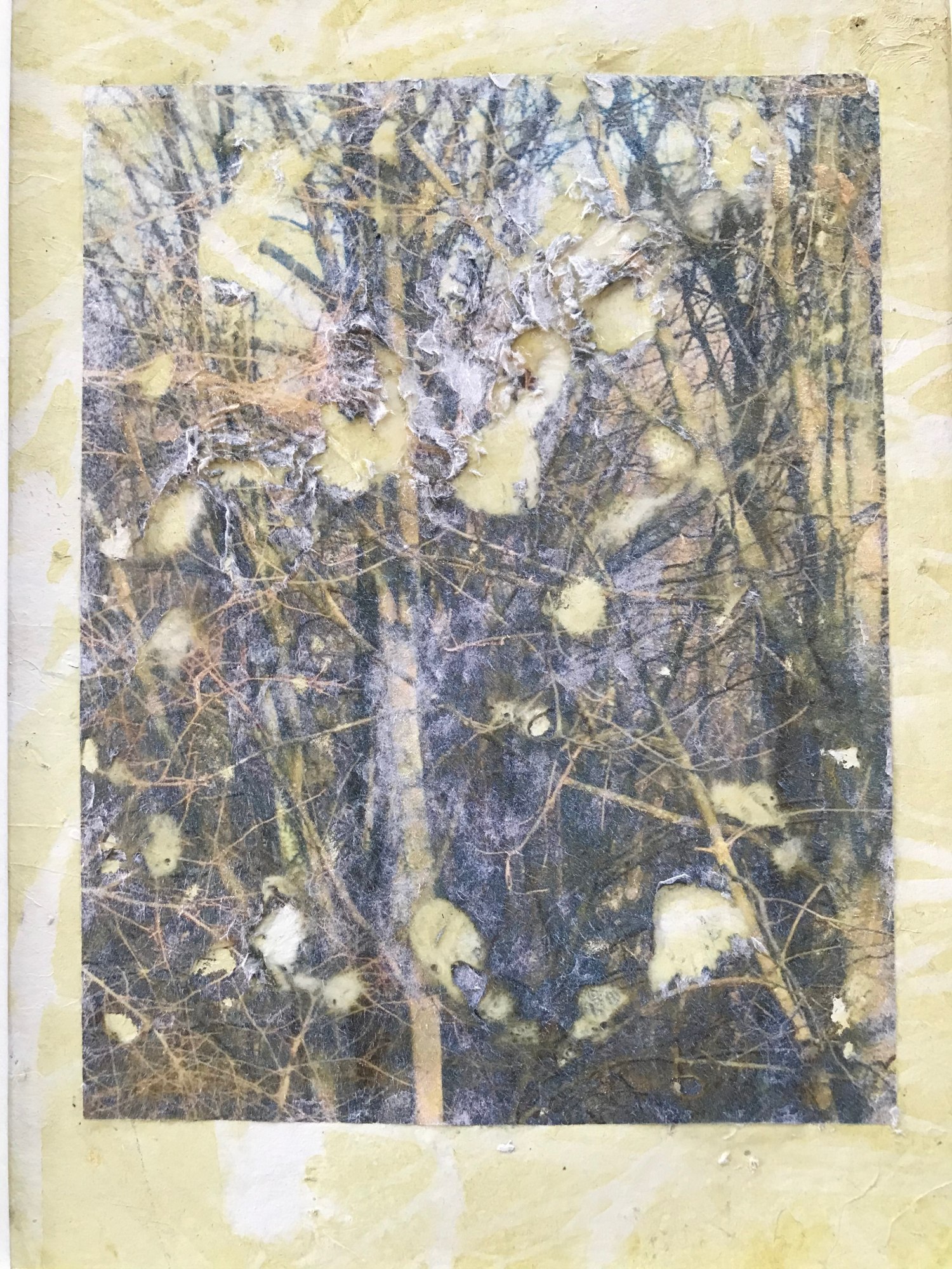 Tree Light Study Light is a fresh, contemporary take on mixed media landscape study, that explores subtle variations of color and transparency reflected as abstract forms. This 7 x 5" mixed media study on paper, in a 10x8 mat" is part of an on going series of daily observations of local landscape and atmosphere.